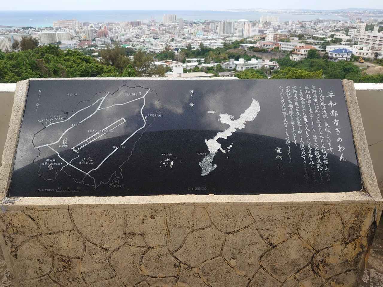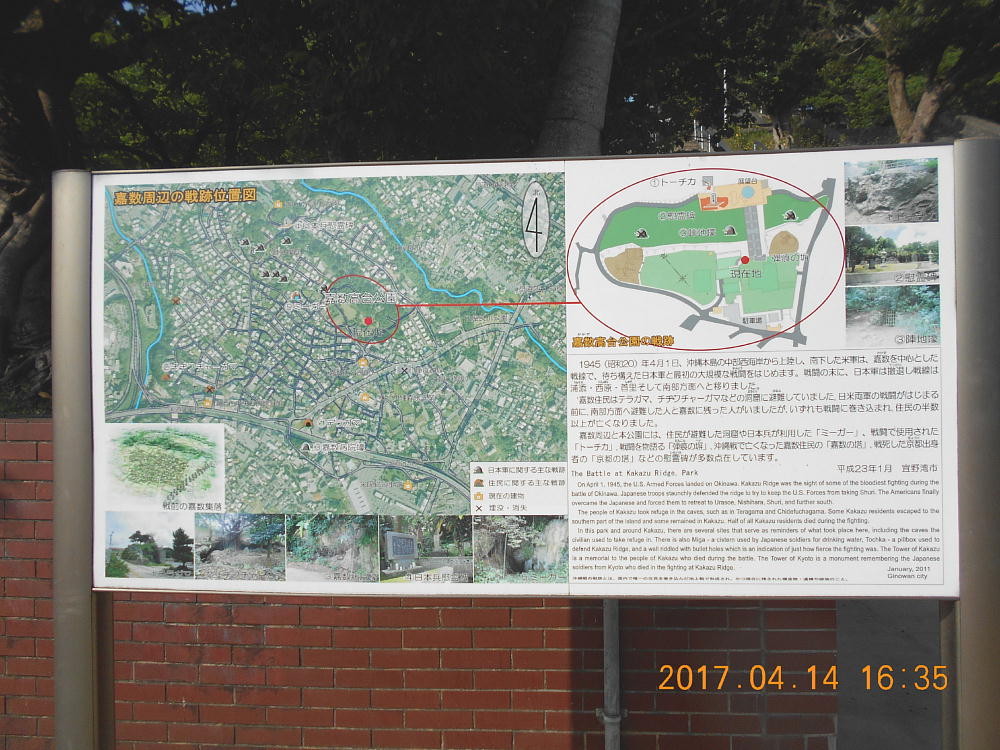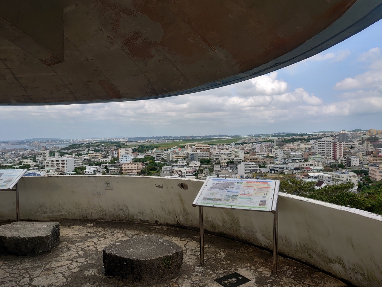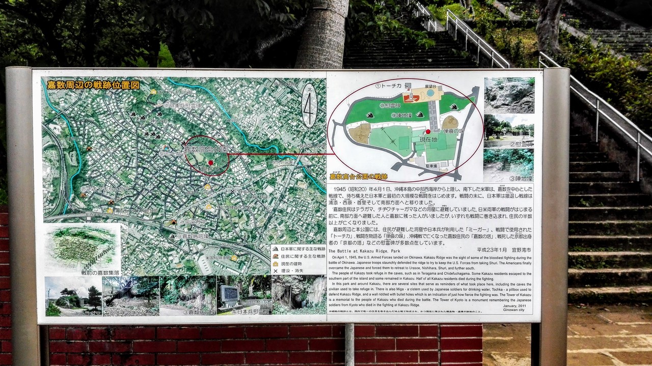 嘉数という地区自体が、太平洋戦争時の沖縄戦の激戦地としても知られていますし、現代的な意味からも、普天間基地や辺野古のことに思いを馳せるのにはとても良い場所だと思います。戦跡としても、公園内に色々と残されていますので、併せて見学されていくと良いです。