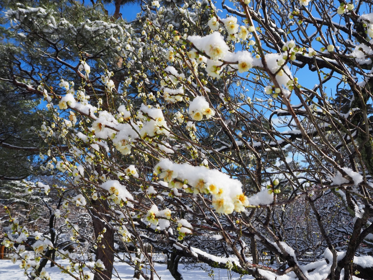 翌朝は夜に降った雪が積もっていました。こちらも雪国金沢らしくとてもきれいでした。晴れてきて、雪の白と青空、緑の松のコントラストが映えました。今年は暖冬で、一部梅の花が咲いており、雪が積もり寒そうでした。  閉じる
