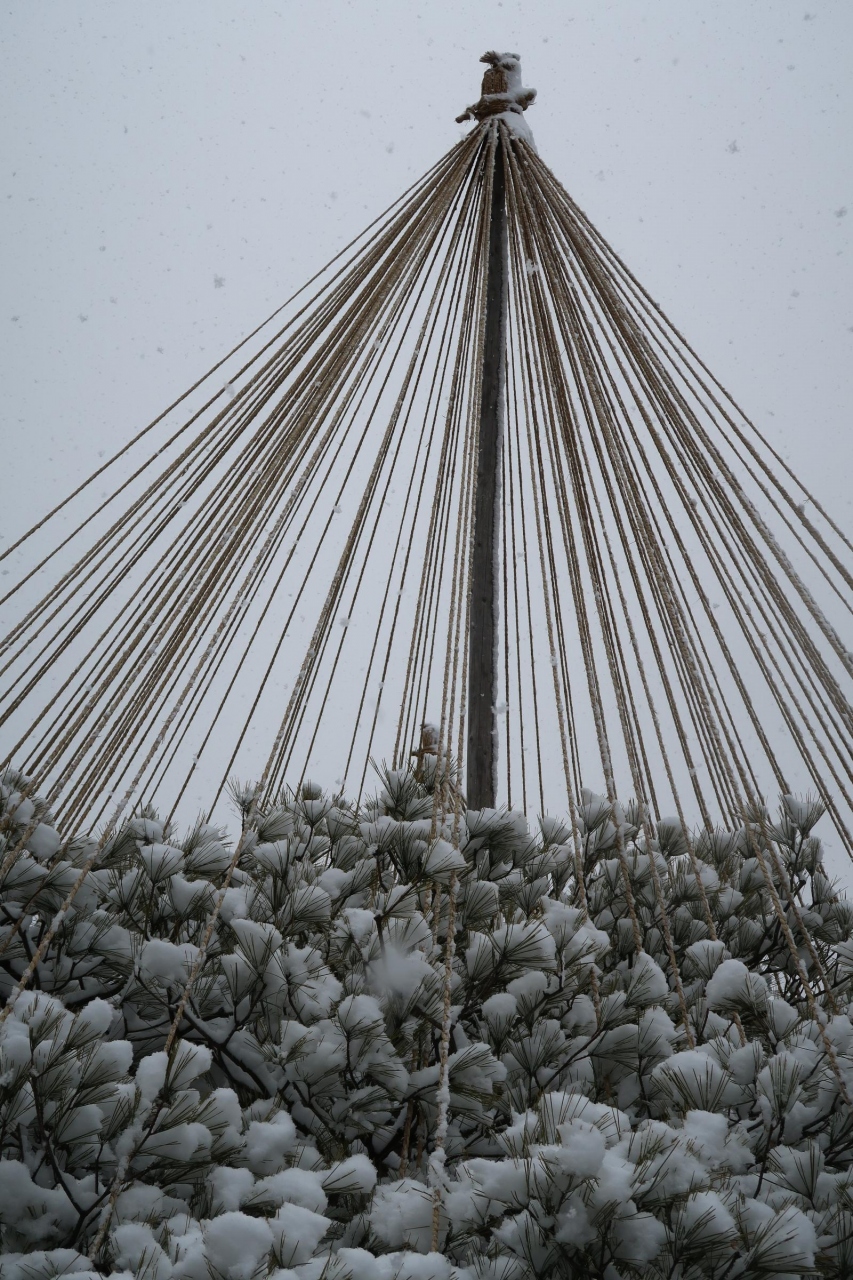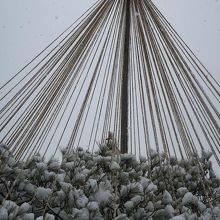 雪吊りに重たそうに雪が積もる景色は気候的に難しいですが、これだけ降ったら