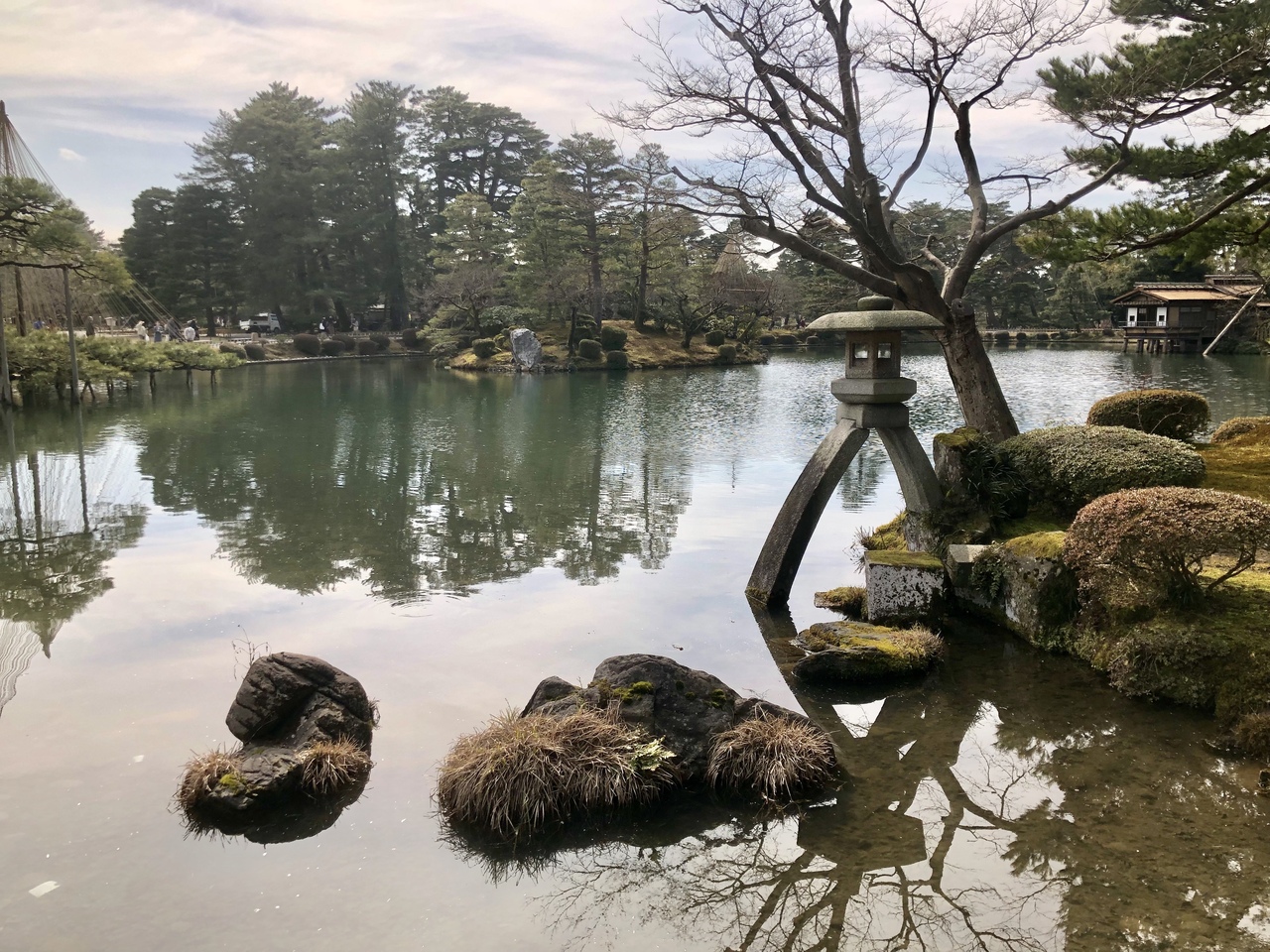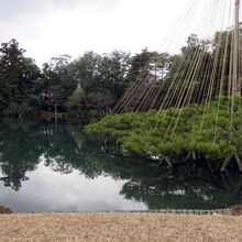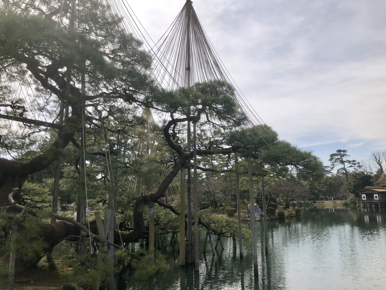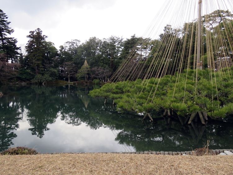 雪吊りに雪が積もってこそ兼六園の風情だろうけど2月なのに一切雪が無い。