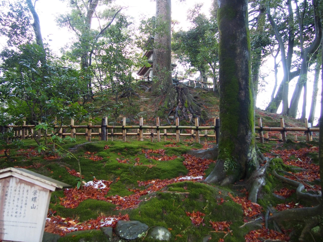 霞が池を掘った際の土を盛り上げて作られた小山。らせん上の登り口がついているから栄螺山と呼ばれるそうな。