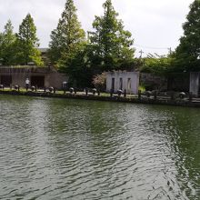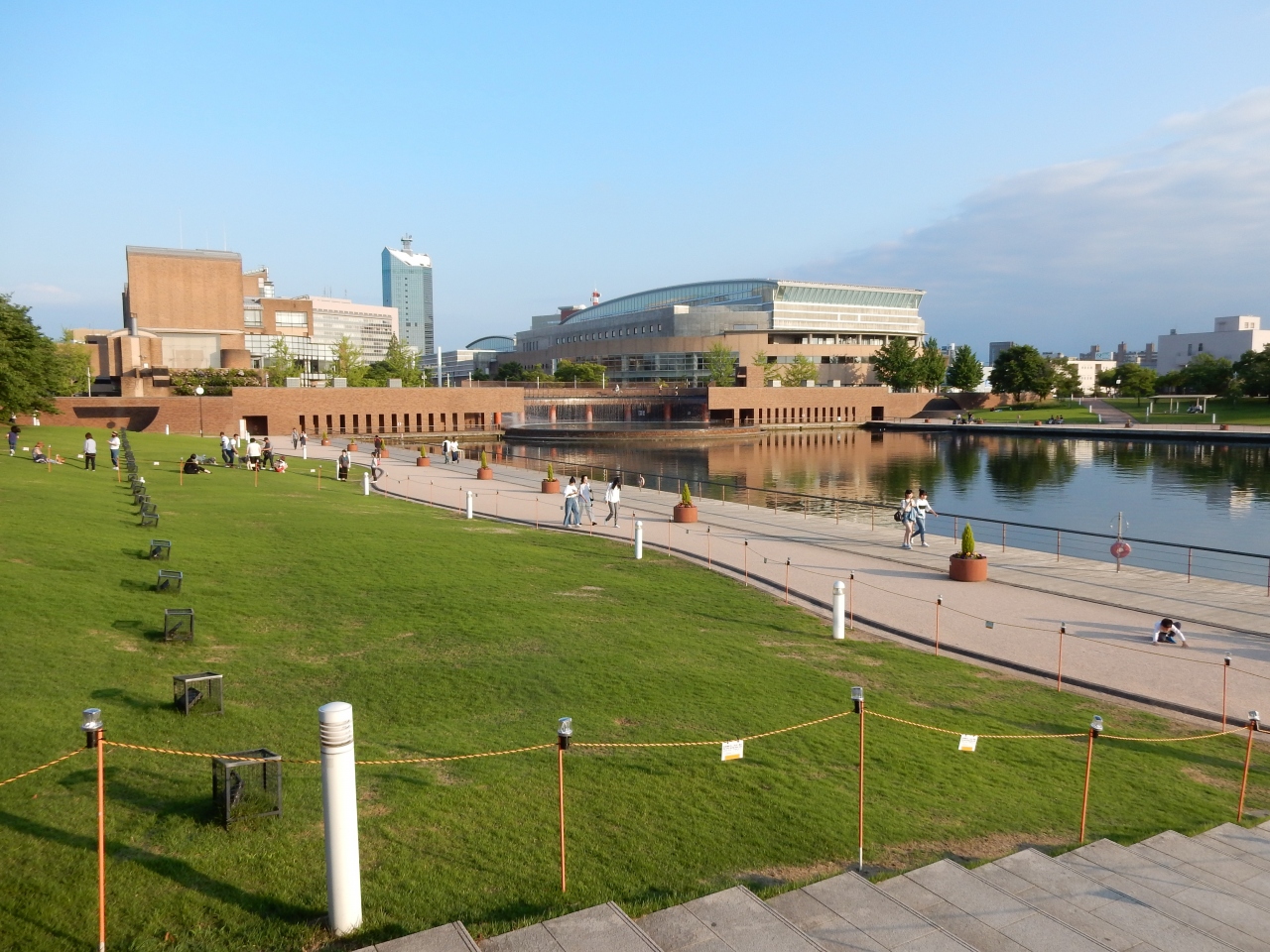 この公園は富山駅北口から徒歩10分のところにあり、富岩運河を囲むように 広がる緑の美しい水辺空間で、芝生が広がる開放的な園内です。