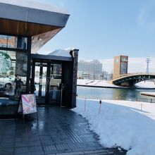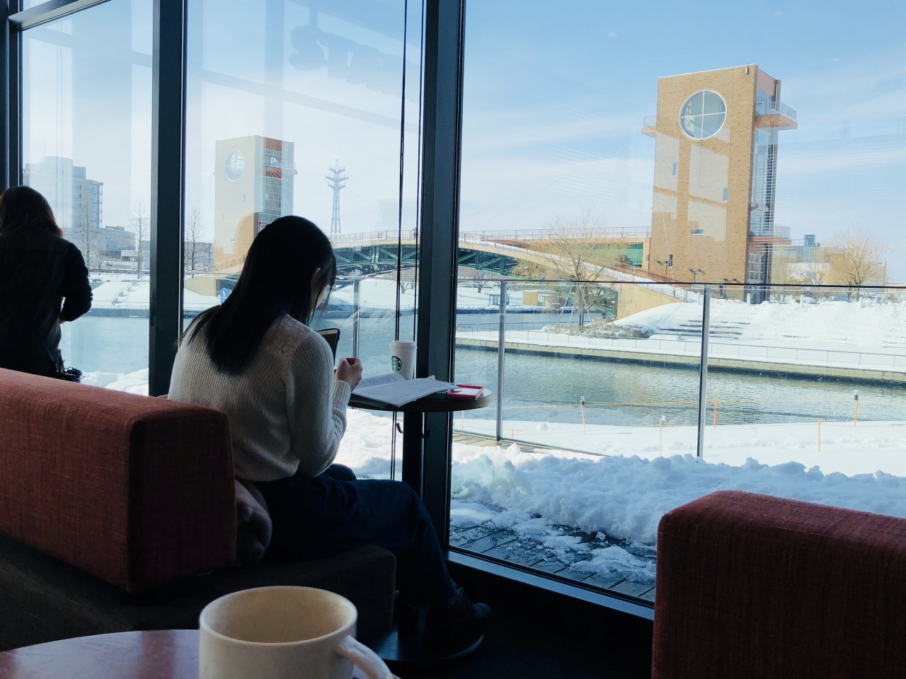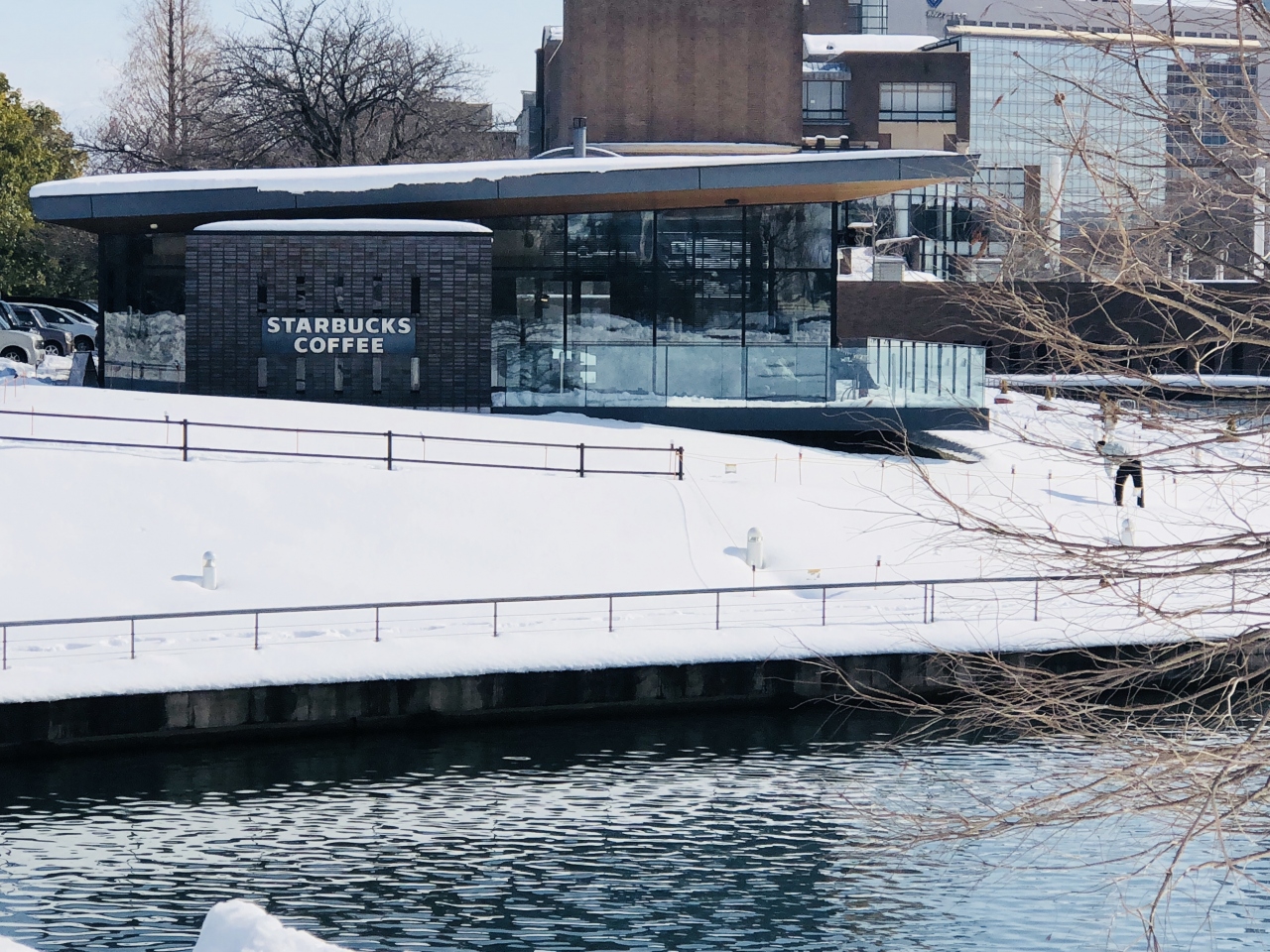 世界一のスタバって言うけれど外観はガラス張りで何処にでもあるような。。至って普通。だけど席に着いた時、目の前に広がる運河、、、と雪、、、は絶景◎