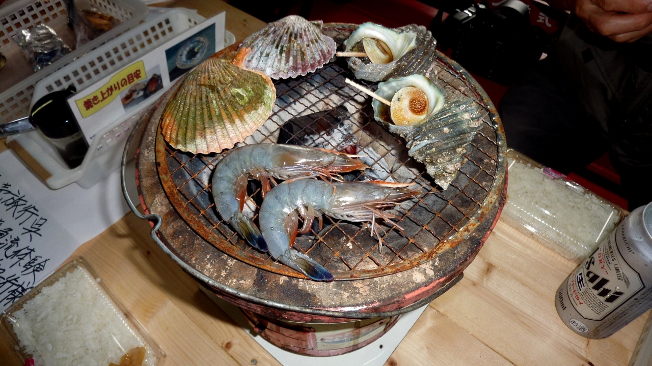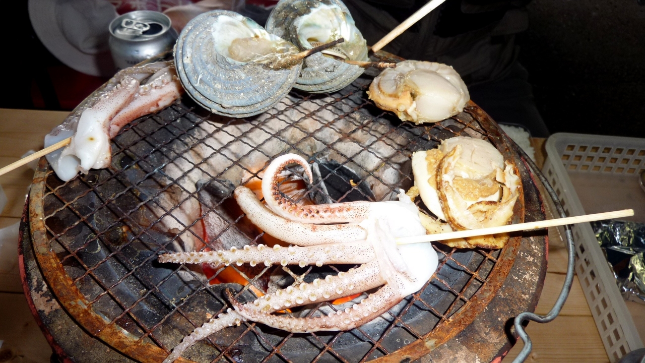 海鮮には、アワビ、サザエ、せと貝、ホタテ、ハマグリ、車えび、イカ、太刀魚などいろんな種類の魚介類が用意されており、各自が七輪の炭火で焼いて食べられるようになっている。