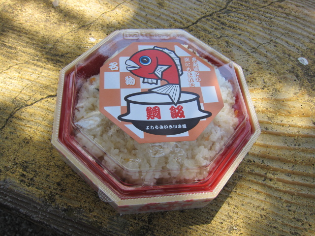 レストランも満員で入れなかったので、鯛飯を購入してベンチで食べました。