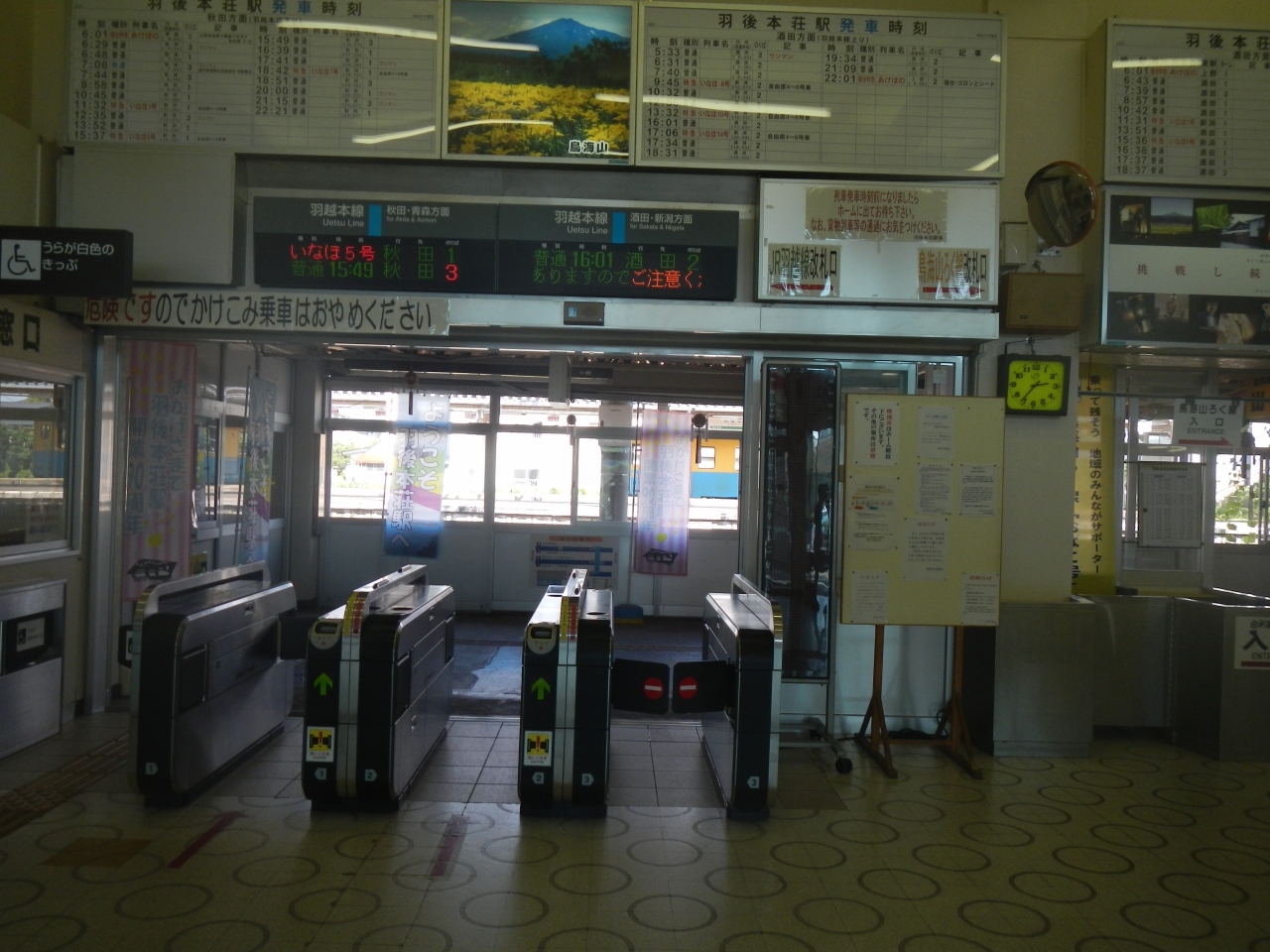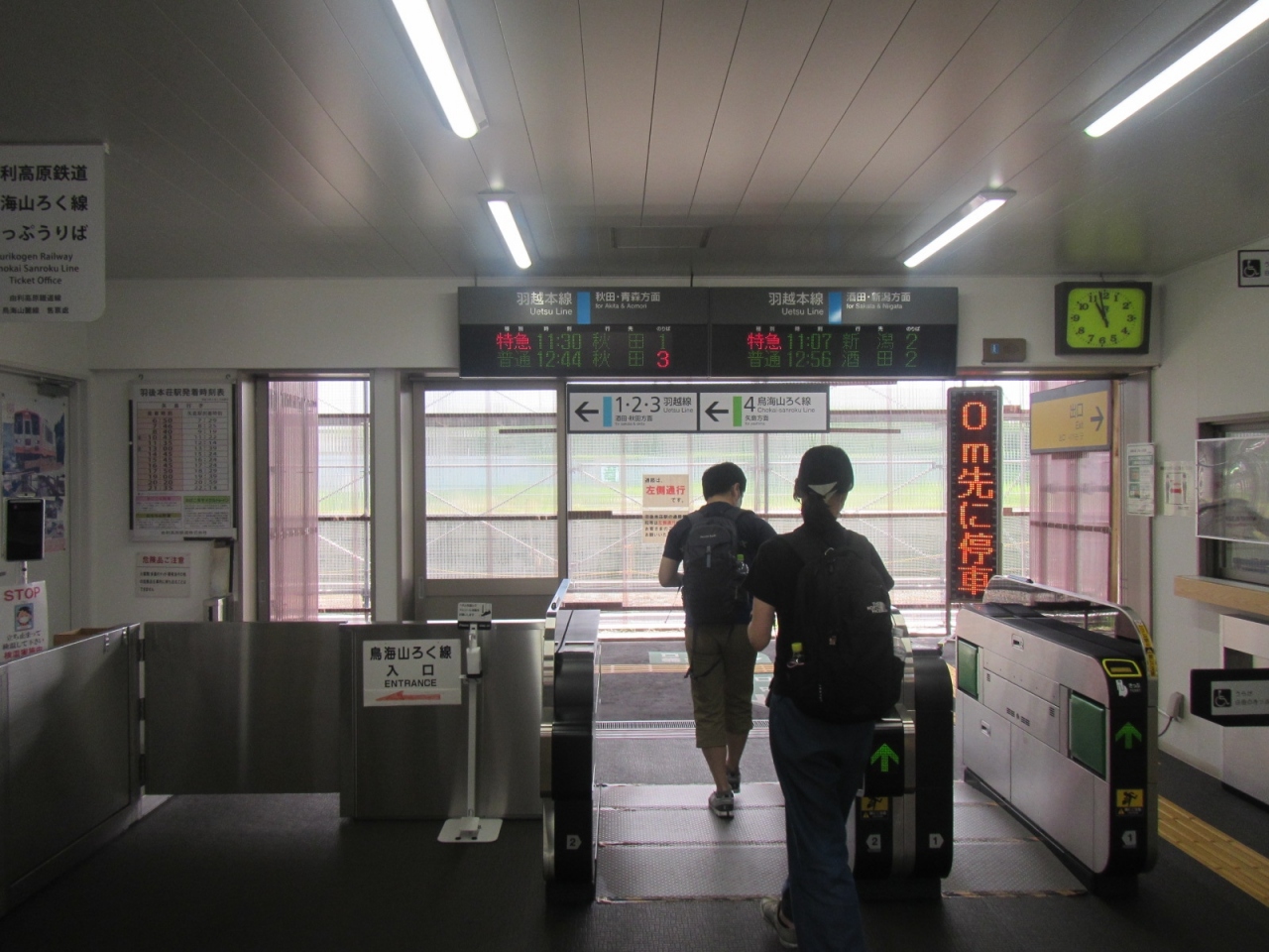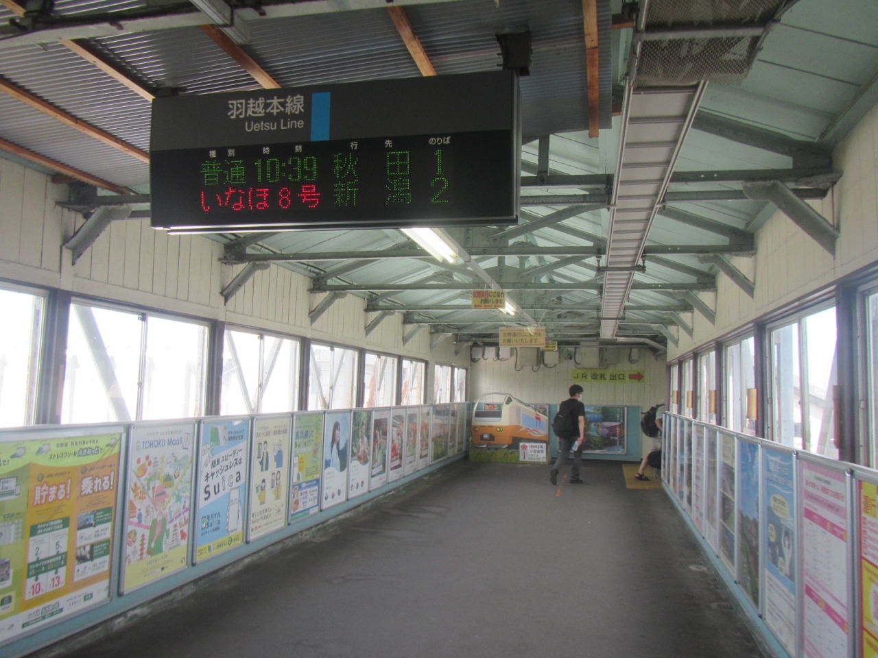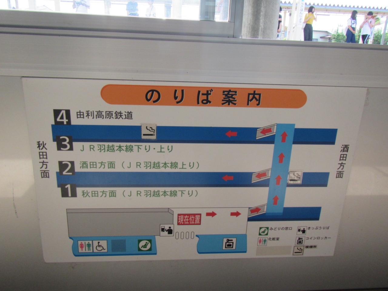 羽越線、由利高原鉄道ともに、駅舎から跨線橋を渡ってホームへ移動せねばならず、駅舎側36段、ホーム側27段または29段の階段を登って列車に乗らなければなりません。