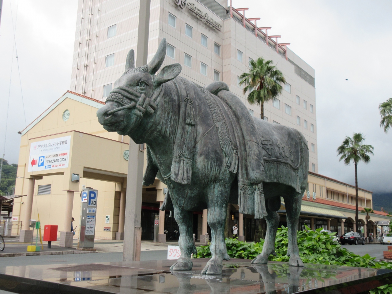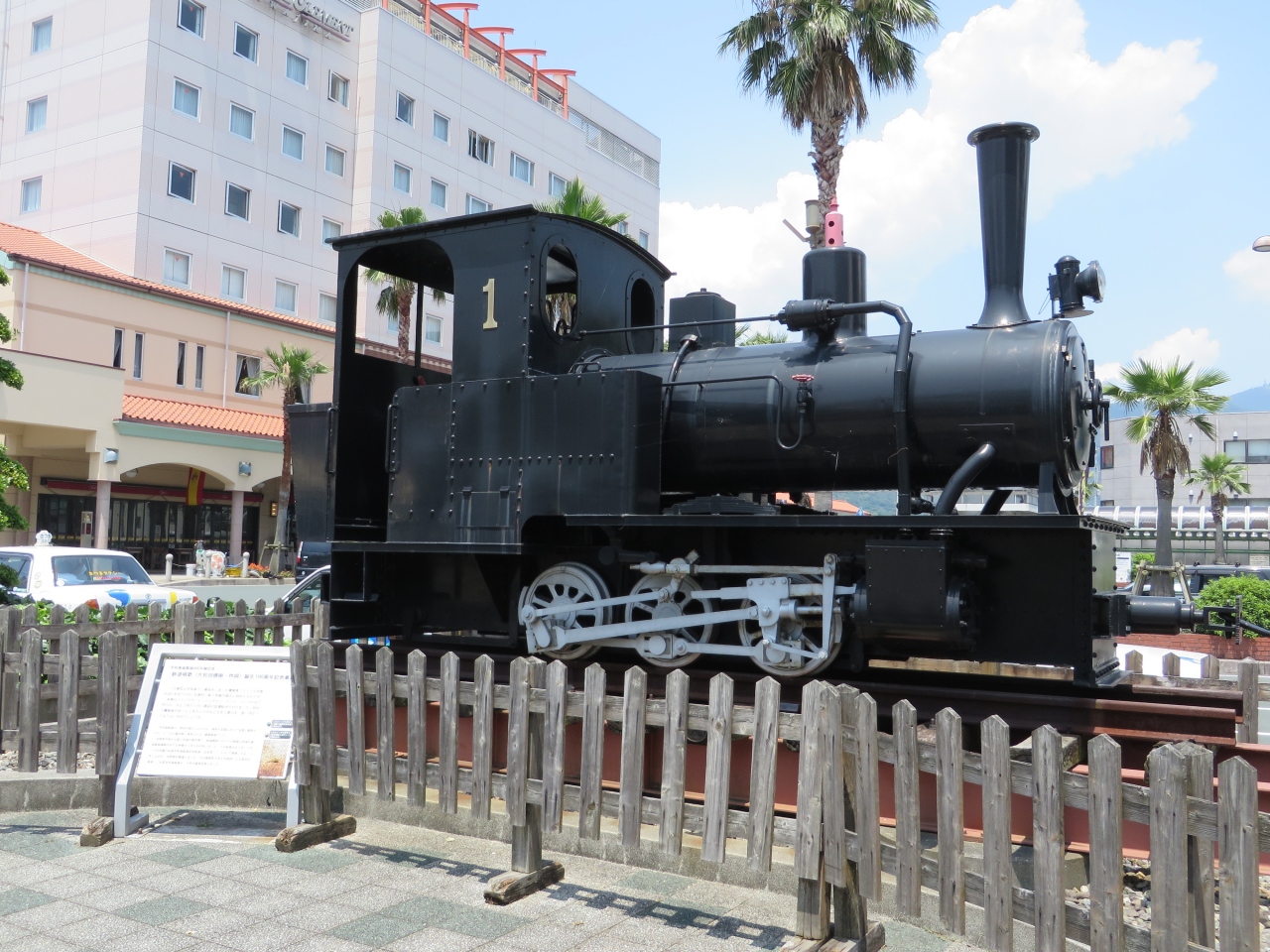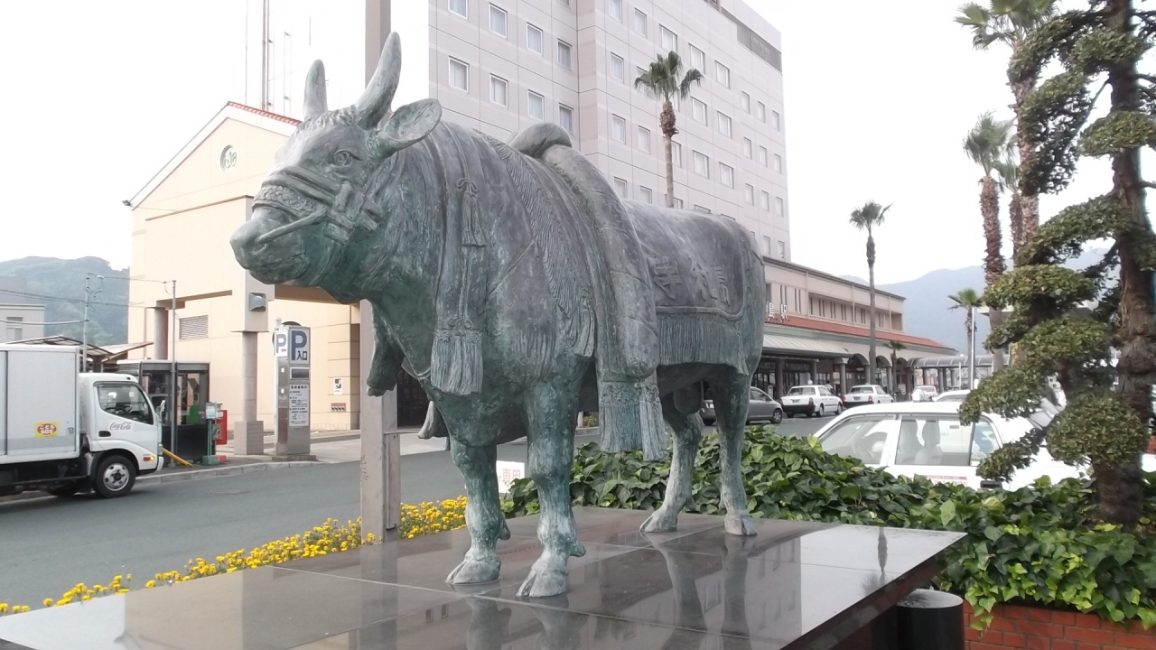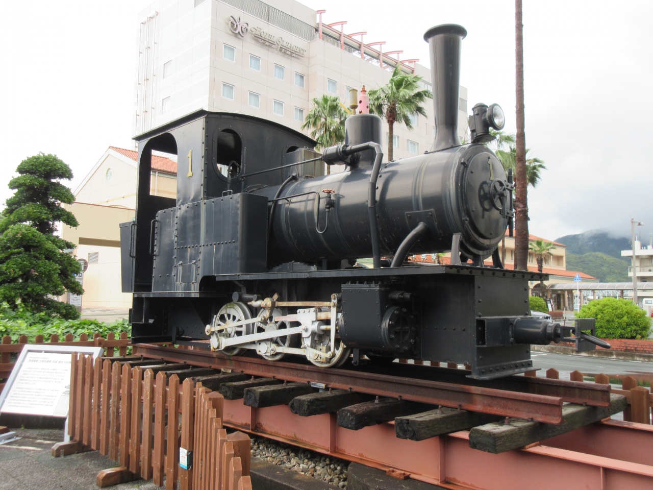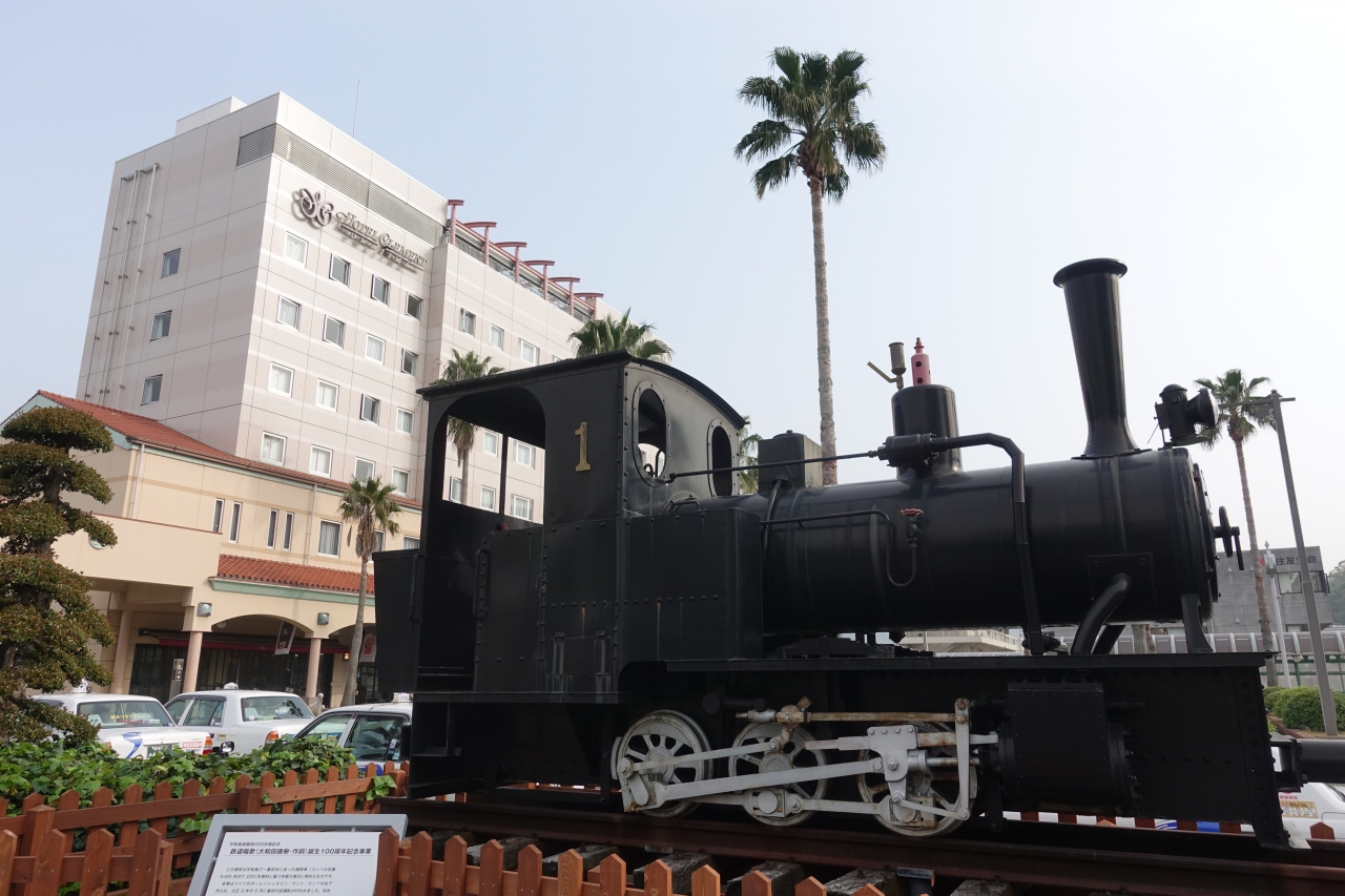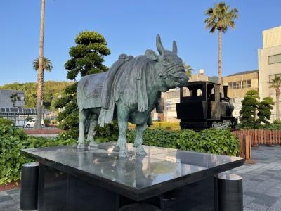 駅前にはヤシの木の並木と、闘牛の銅像、蒸気機関車があります