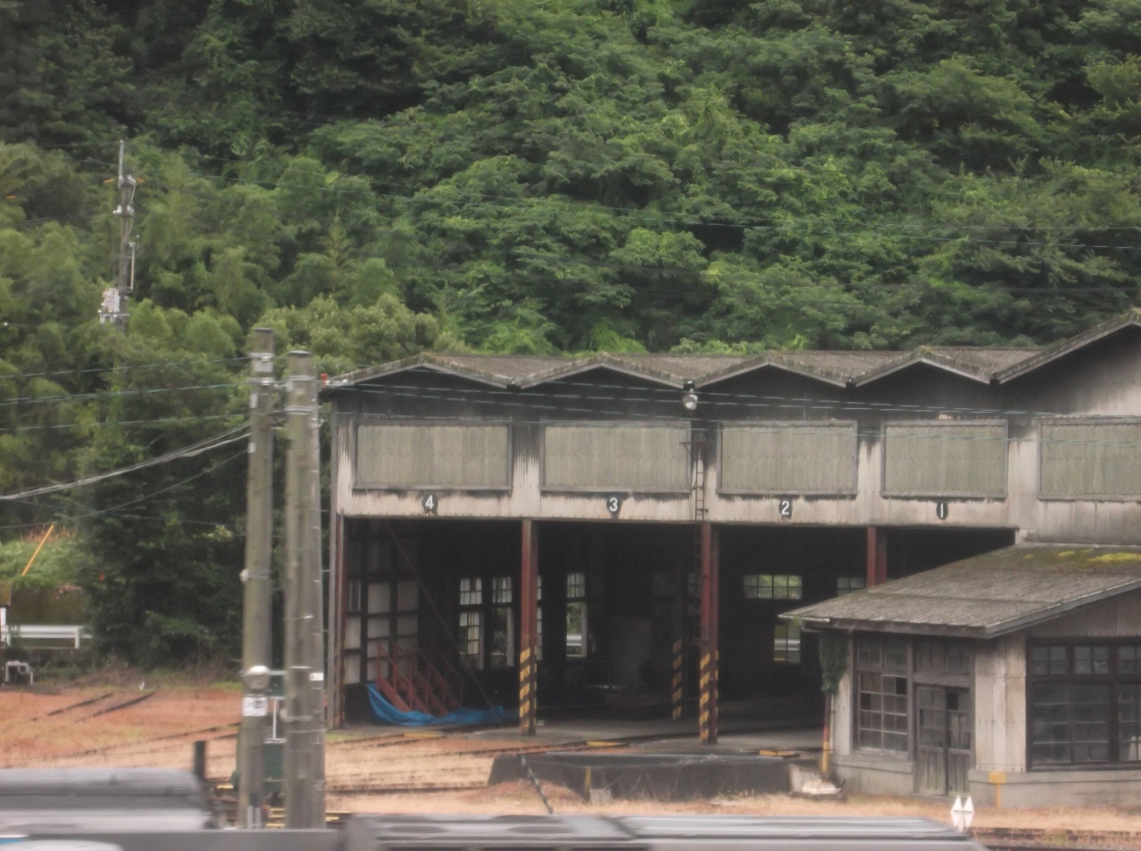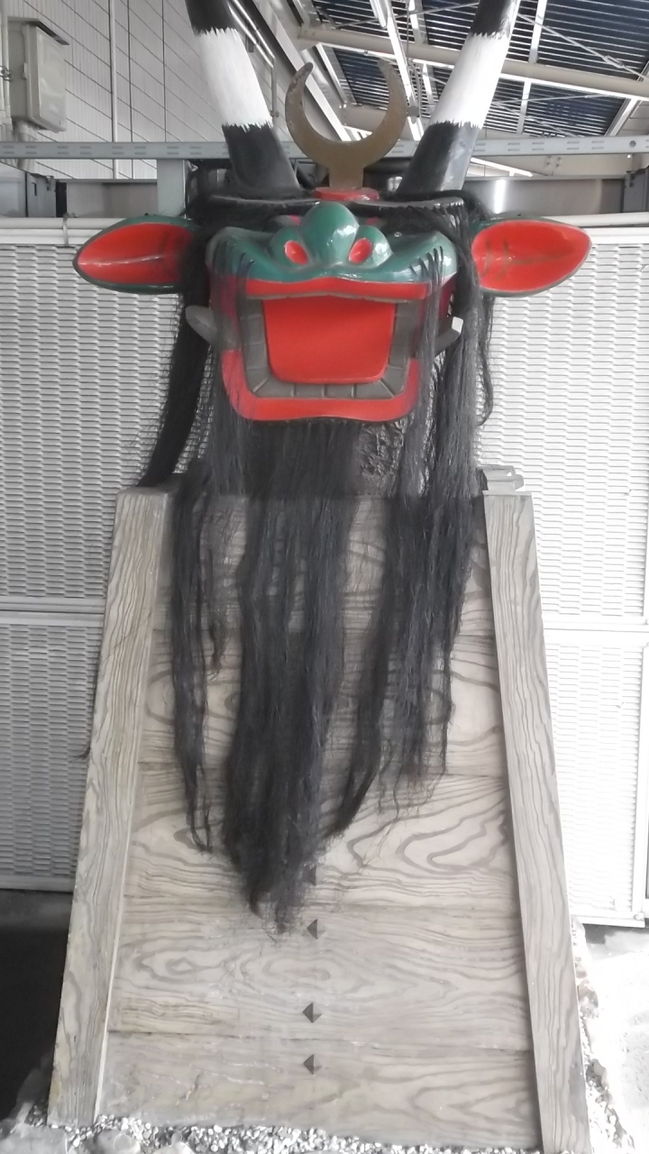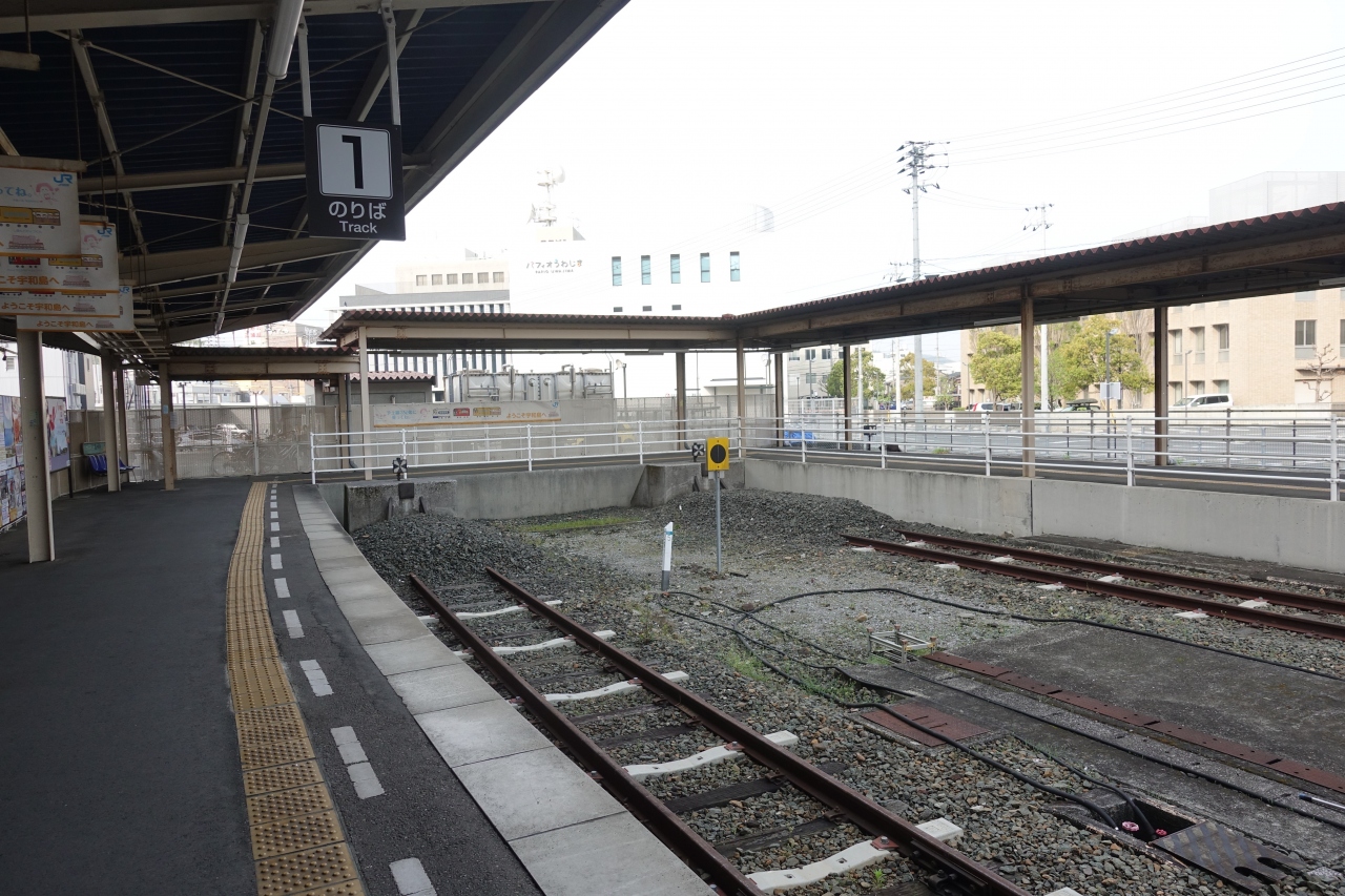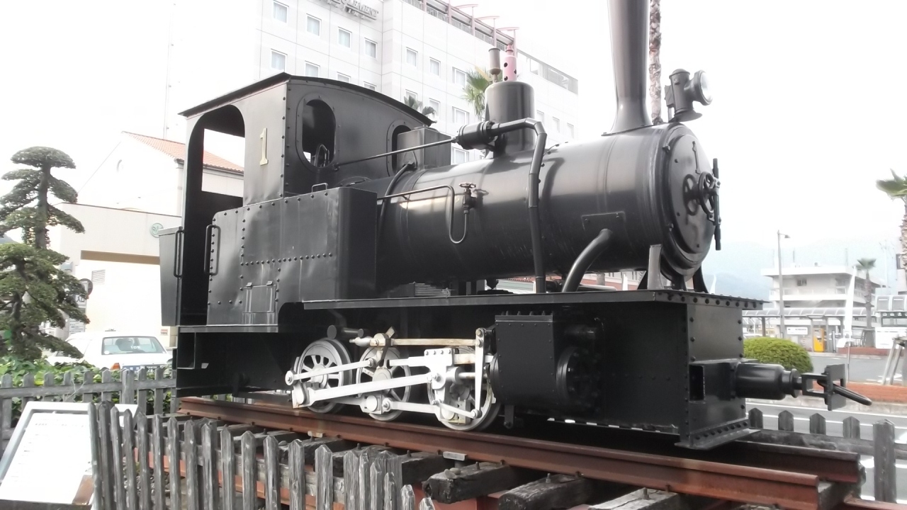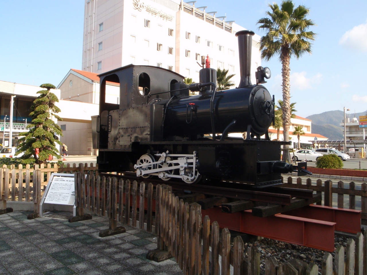 駅前にはヤシの木の並木と、闘牛の銅像、蒸気機関車があります