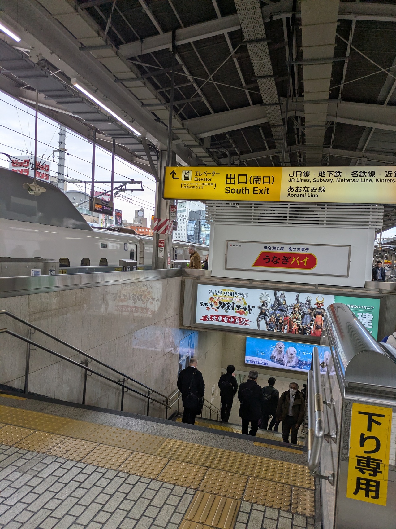 名鉄側から降りると改札をでなくても名古屋の駅では珍しくテイクアウト専用のスタバがあります。ただ、この改札に行くのにエレベーターもエスカレーターもありません。