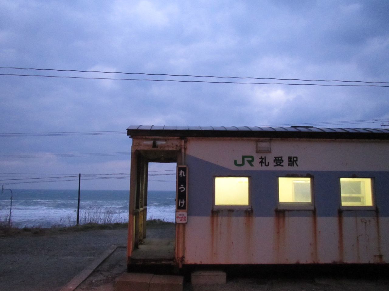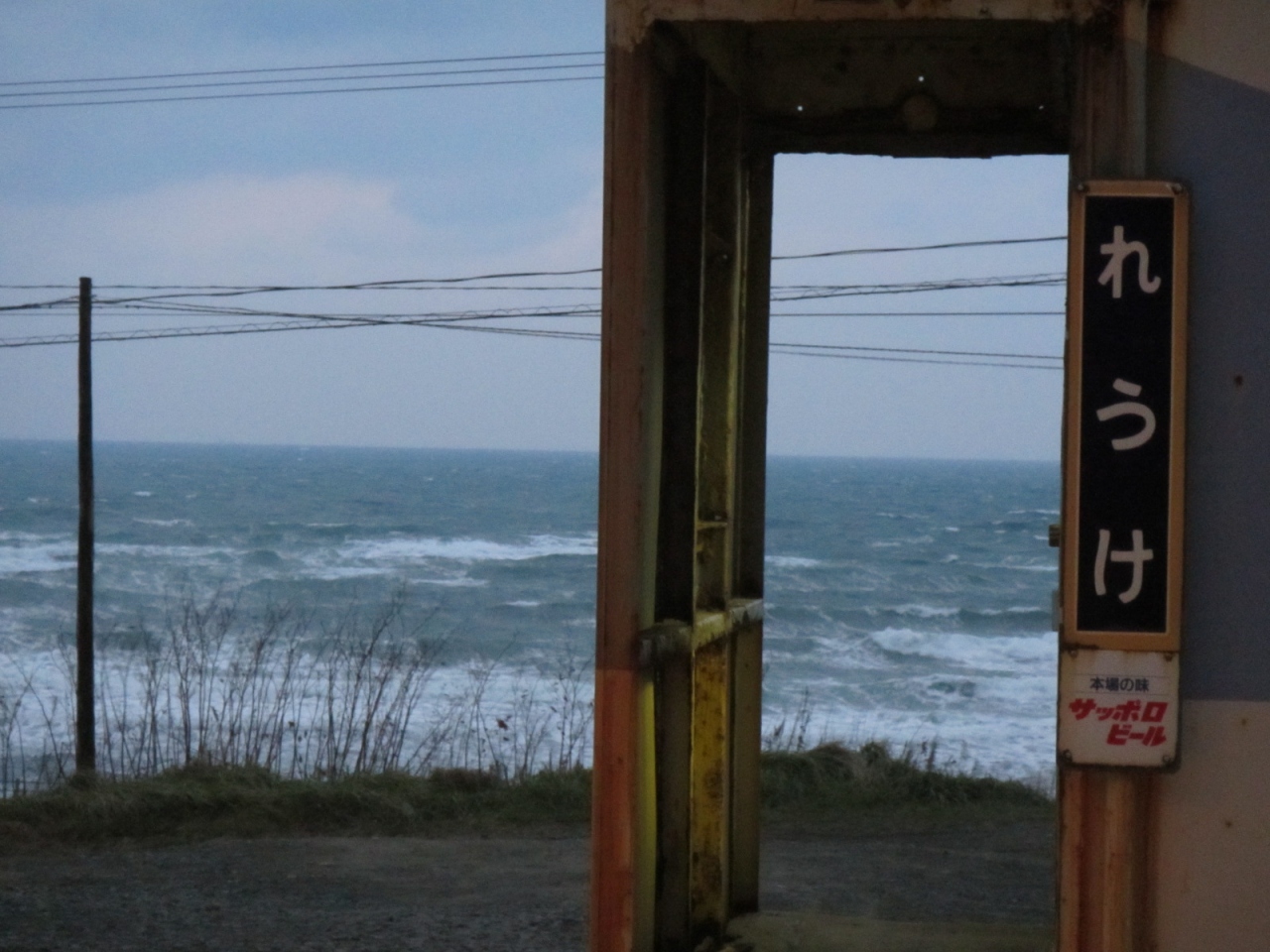 車掌車の駅舎の背景には寒風... 続きを読む吹きつけ、荒波打ち寄せる日本海が見えています。