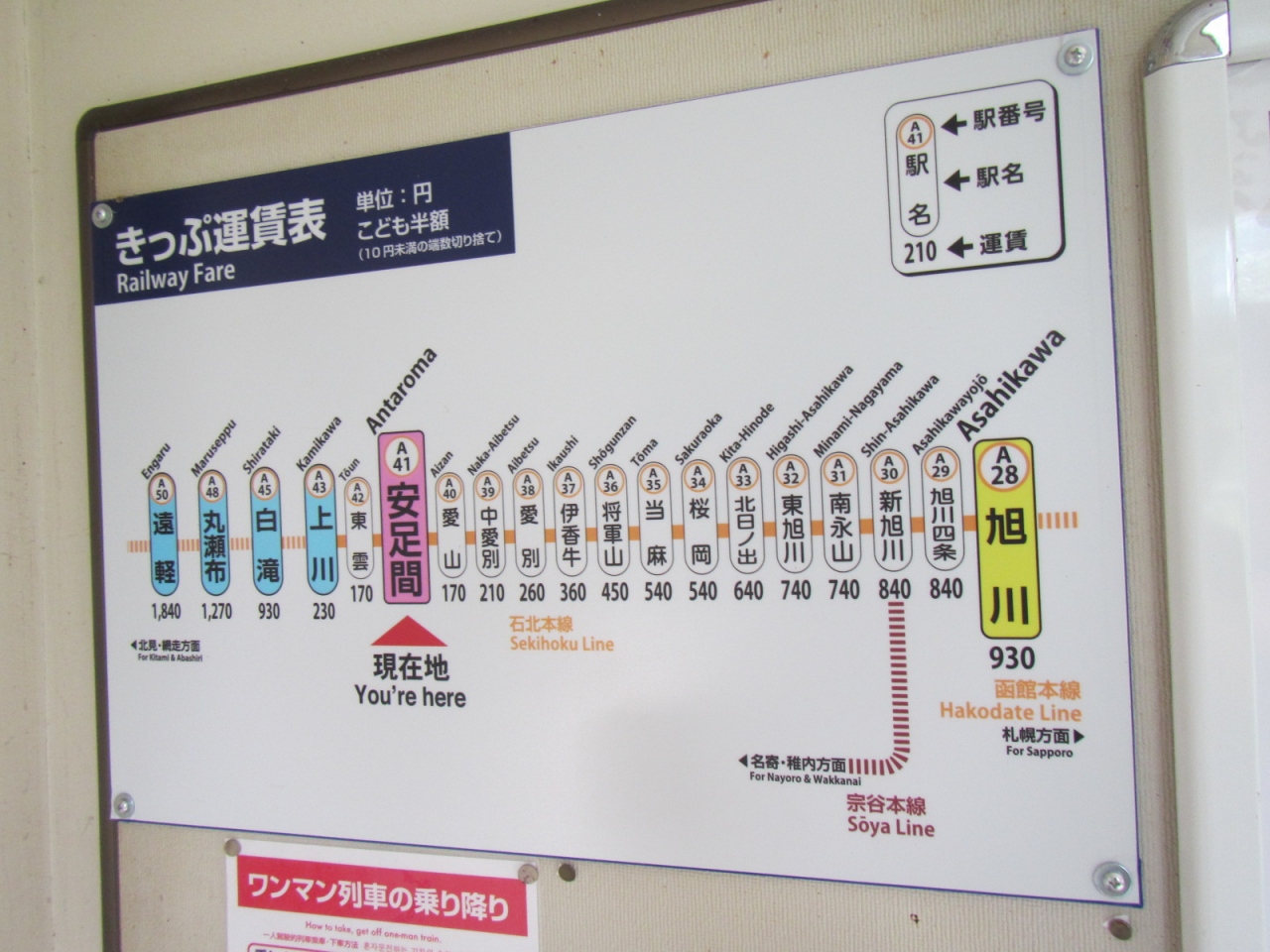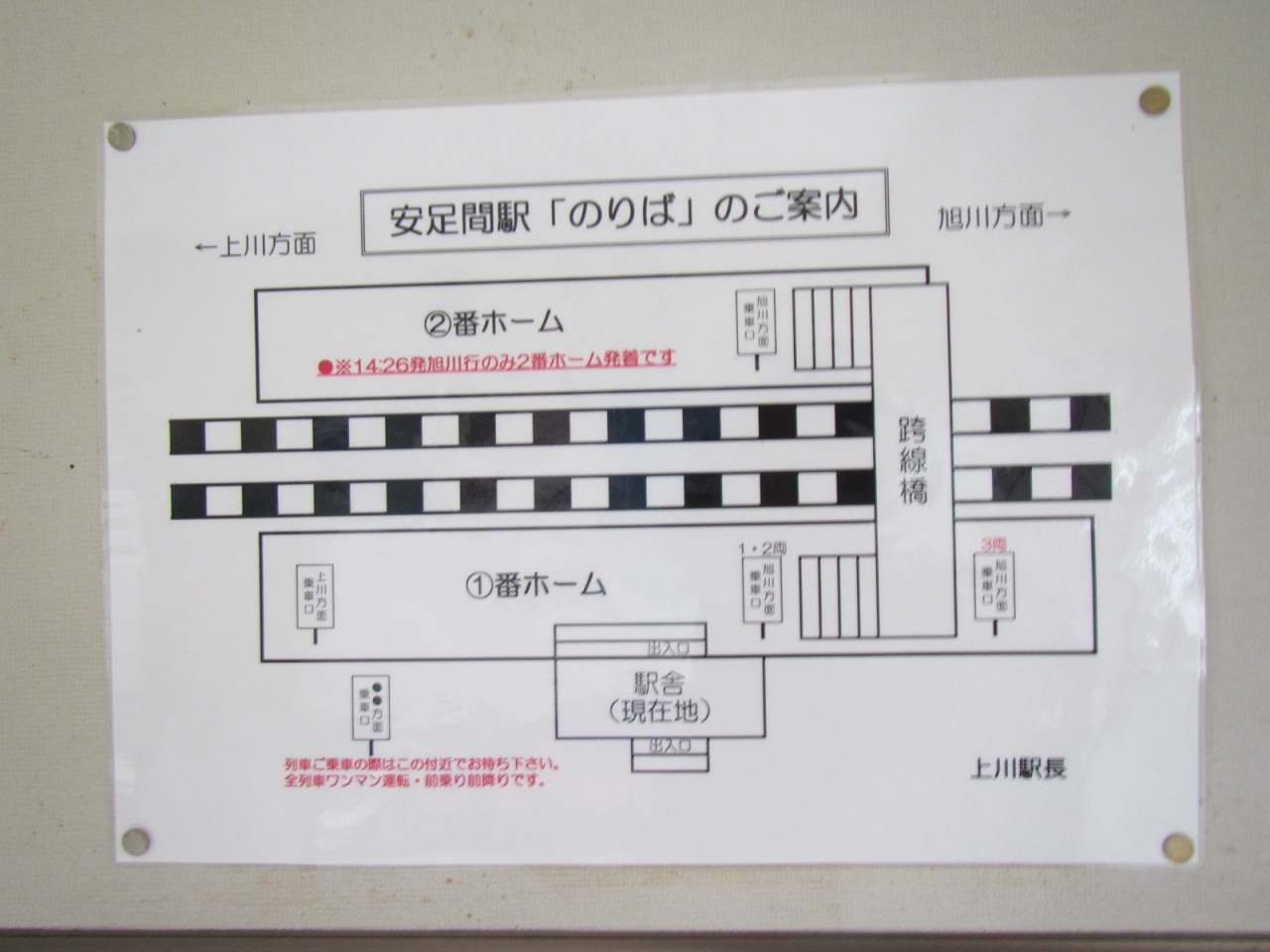 駅は無人駅で、駅舎がある1番線ホームと、30段又は31段の階段の跨線橋で渡る2番線ホームがありますが、駅に停車する(ドアが開く)ほとんどの列車は1番線に止まり、2番線を利用するのは14時26分の旭川行き、1本のみ(2018年9月現在)なので、階段を登る必要はあまりありません。