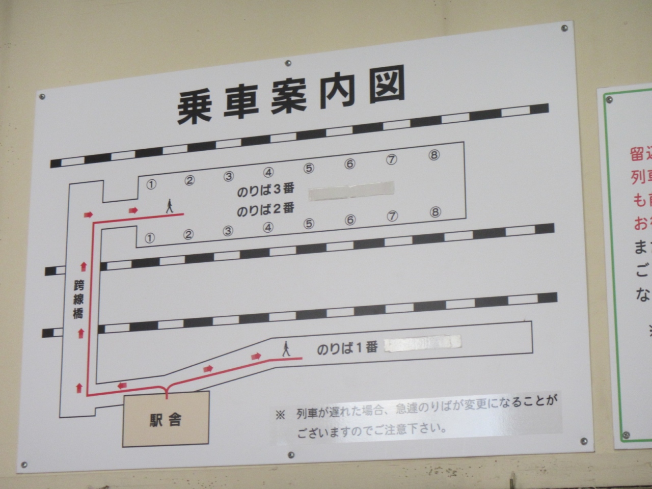 ホームは、主に普通列車が駅舎側片式ホームの1番線で、7段の階段を登ります。