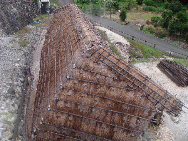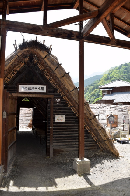 駐車場の奥...  続きを読むに藁ぶきの風情ある建物があり湯の花を採取する小屋でした。