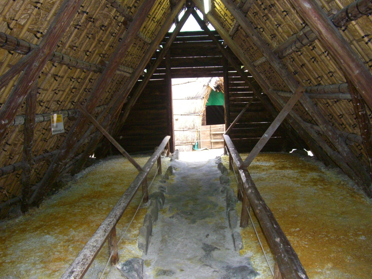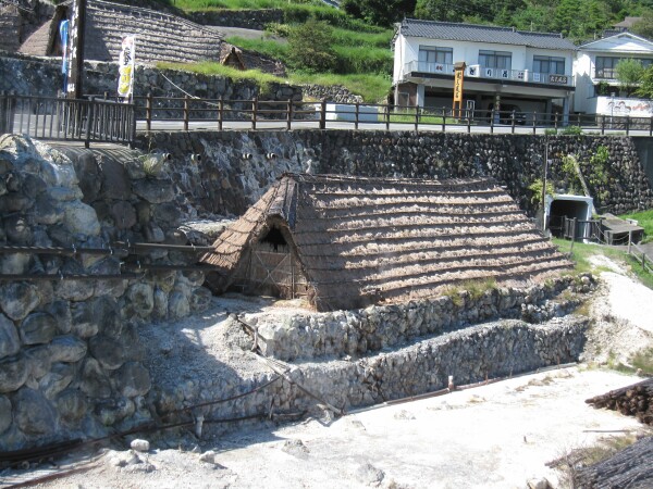 明礬独特の硫黄の匂いの中、立ち並ぶ湯の花小屋の間をぬって散策できます。