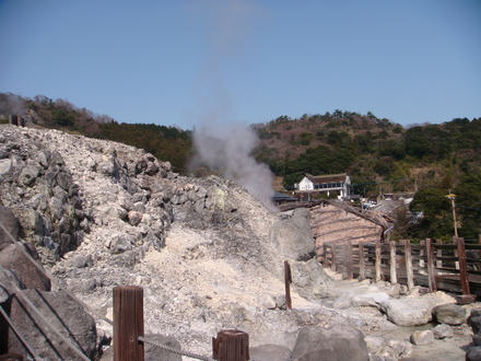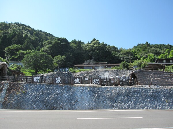 カーブを下りていくと一番...  続きを読む近くで湯気を吹きだしているところが明礬温泉です。硫黄の臭いがあたりに漂い、道路脇も硫黄で黄色くなっています。江戸時代から日本有数の明礬の採取地として栄えていたそうで、入浴剤・湯の花を製造する「湯ノ花小屋」が並んでいます。  閉じる