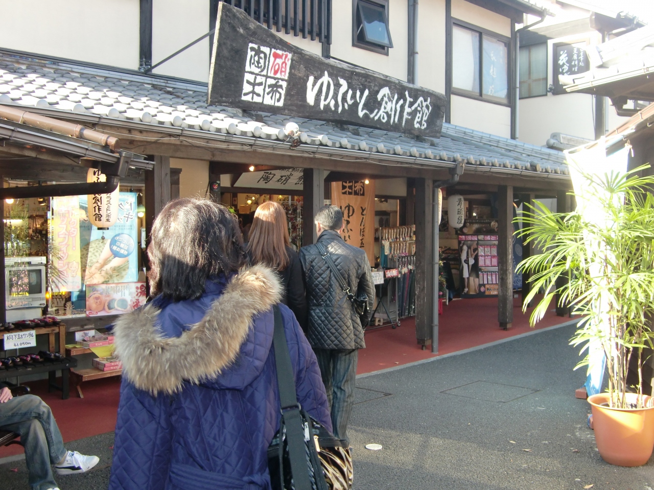 ⑤ その後、近くのコインパーキングに駐車して金鱗湖周辺のお土産物屋さんを散策(お土産物物色のみで、美術館等には立ち寄らない)