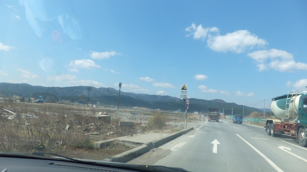 東日本大震災後、奇跡の一本松そばの気仙川(けせんがわ)河口から広田湾の海岸線に沿って新設された長大な防潮堤。