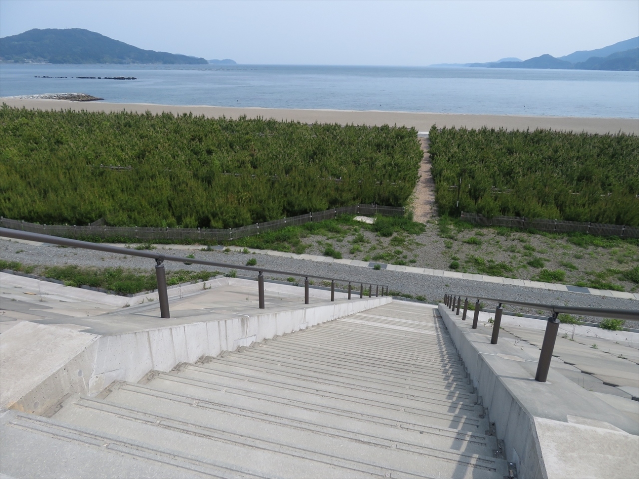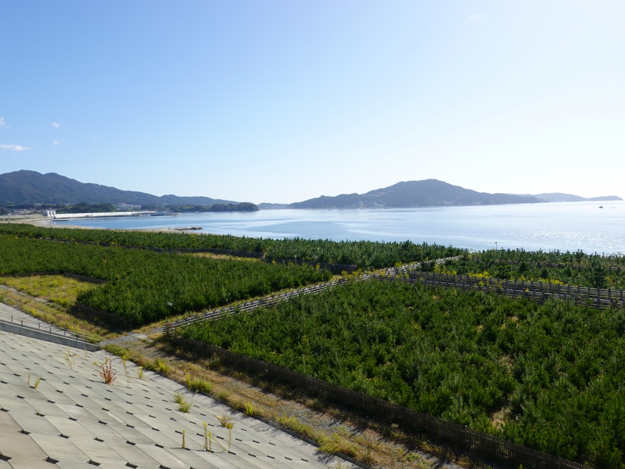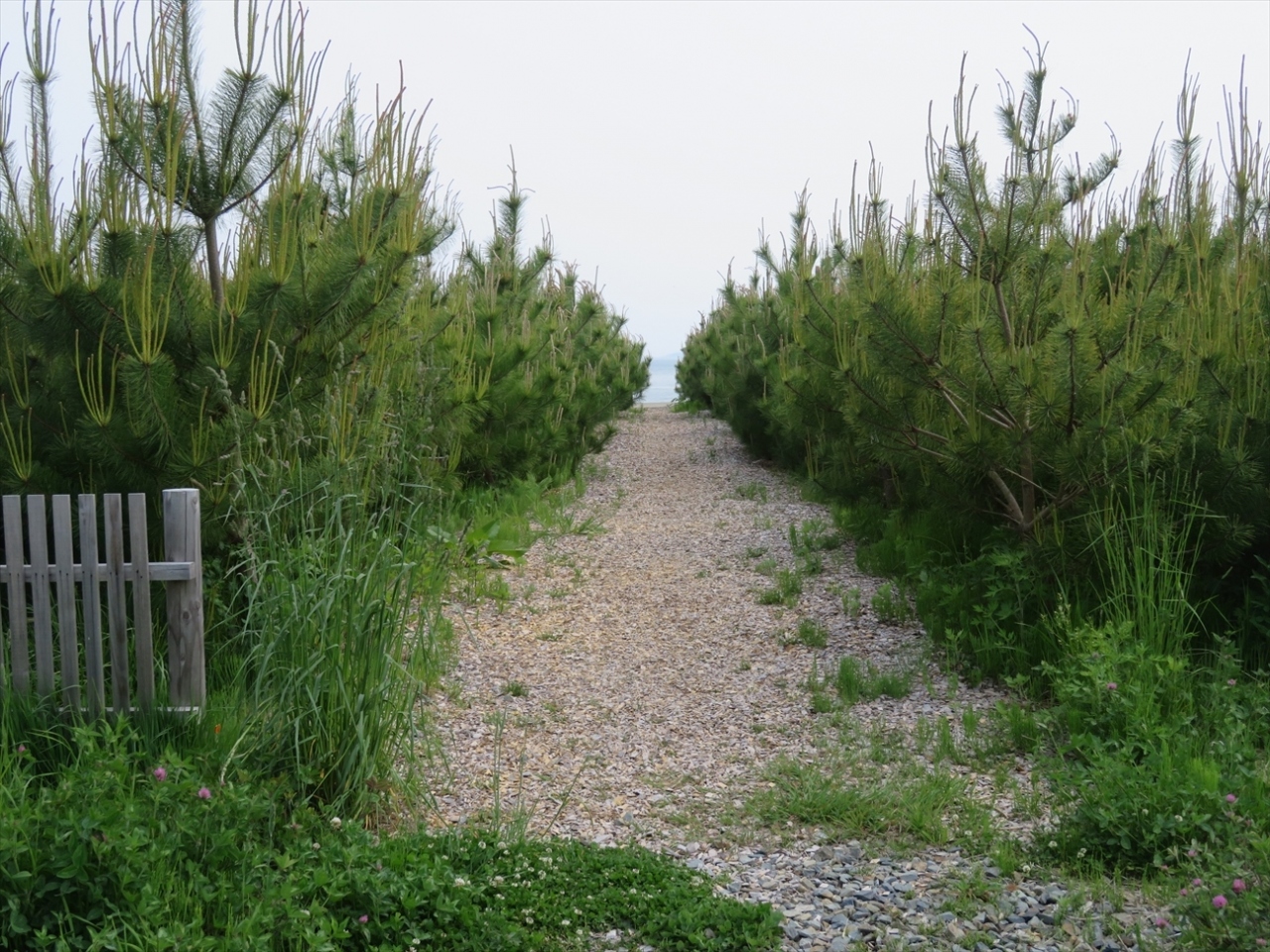 植林後、根付いた松の木の合間の通路を抜けると、大震災時には大津波が押し寄せたとは思えないほど穏やかな波が打ち寄せる高田松原海水浴場の砂浜が広がっていました。