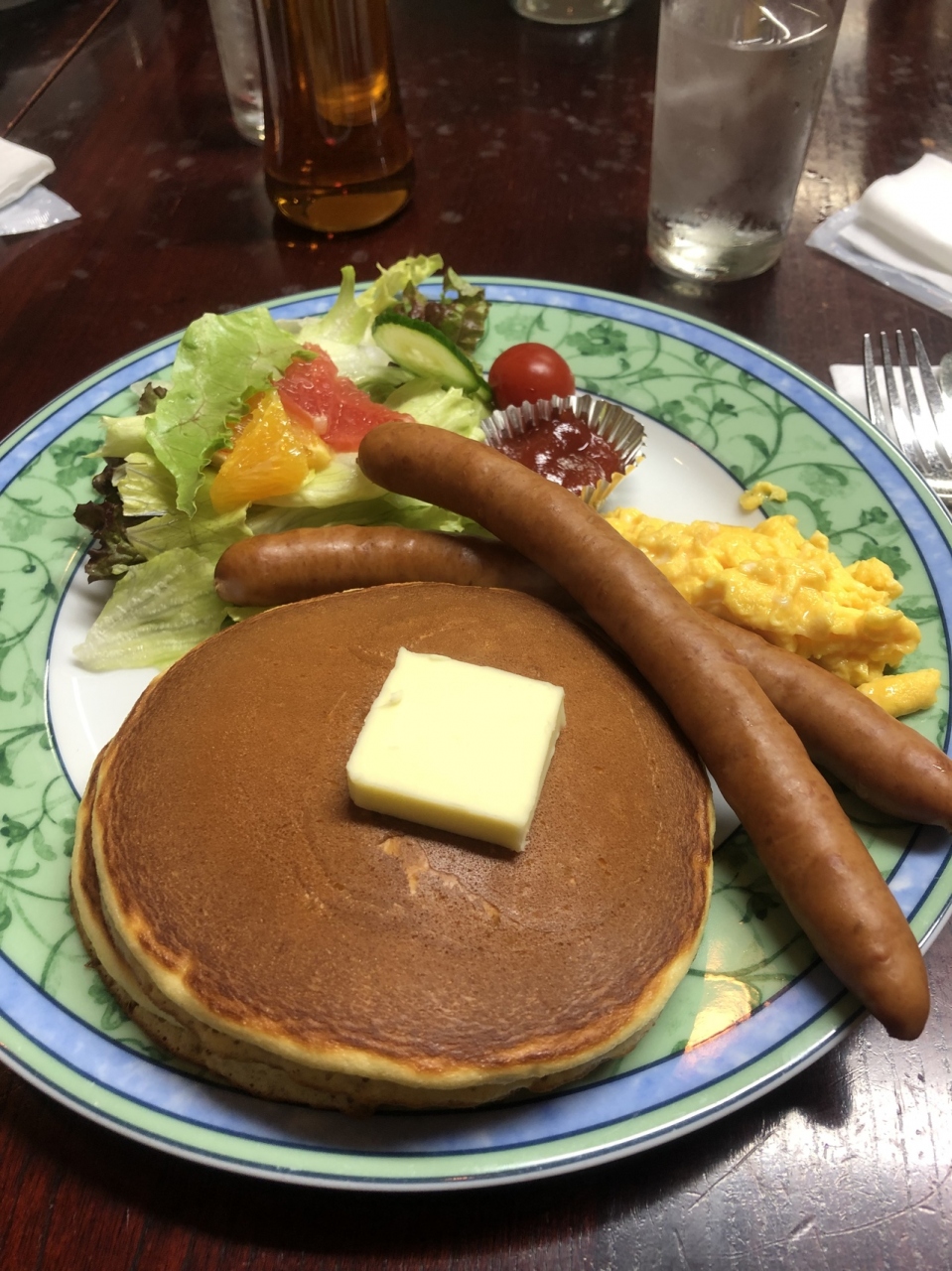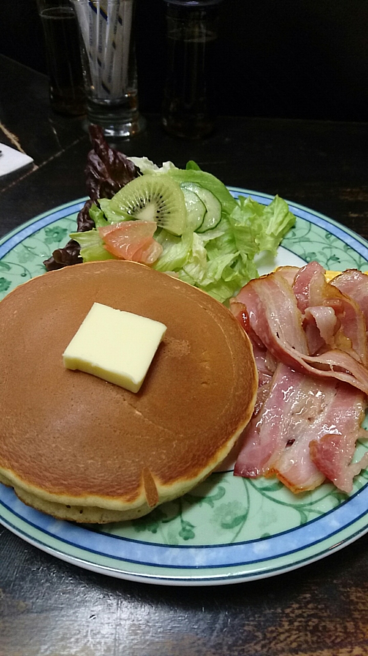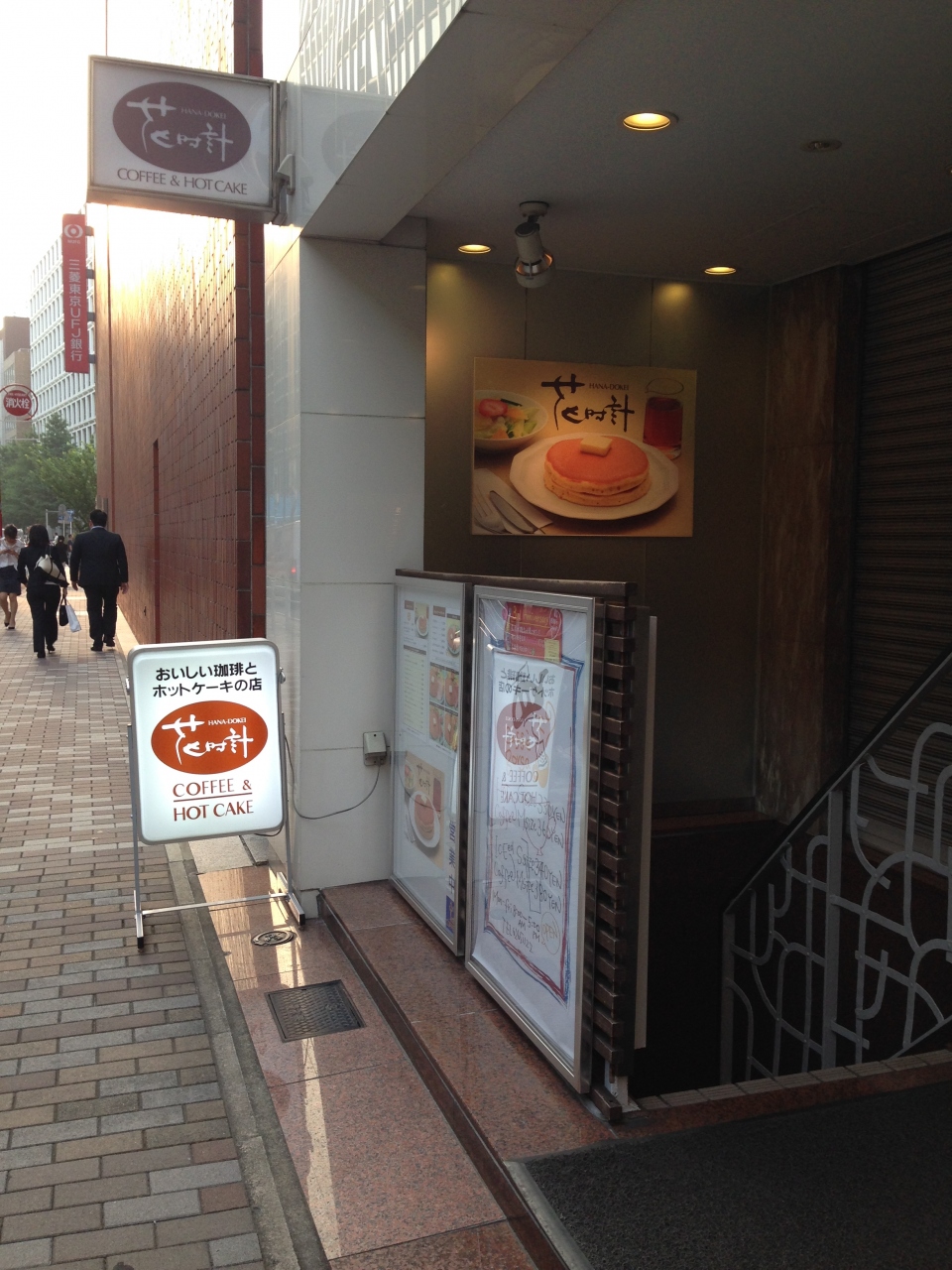日本橋で有名なホットケーキ専門店。コレド日本橋の裏路地の目立たないところにあります。(看板は出ています。)地下のお店はどこ... 続きを読むとなく殺風景。小さなテーブル席がいっぱいあるカフェとは違って、大きなテーブルがどーん、カウンターがどーん、店内は全体的にシーンとしており、お喋りして長居するタイプのお店ではないです。パンケーキ単品もありますが、ランチにはソーセージやベーコンなどが付いたセットがお勧め。パンケーキは真ん丸できれいなキツネ色で2段かさね。パンケーキ自体にほんのり甘みがり、しっとり昔懐かしい味。メープルを垂らすとパンケーキが全部吸収してしまうのでかけ過ぎ注意です。