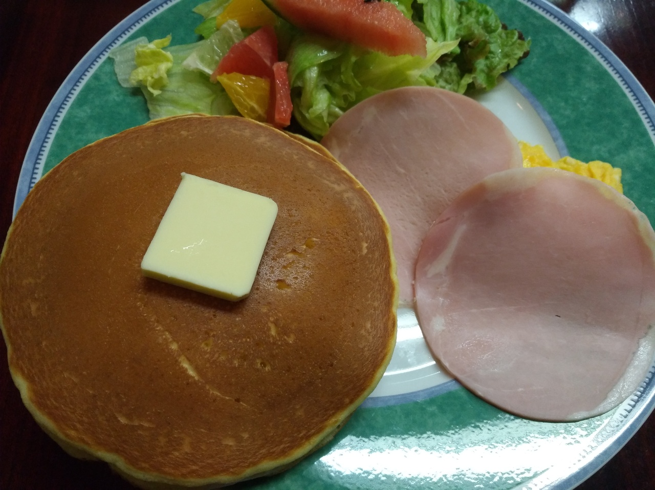 ホットケーキは昔懐かしいタイプで薄めのものが2枚。テーブル上に置いてある大きなメープルシロップはお好みで。