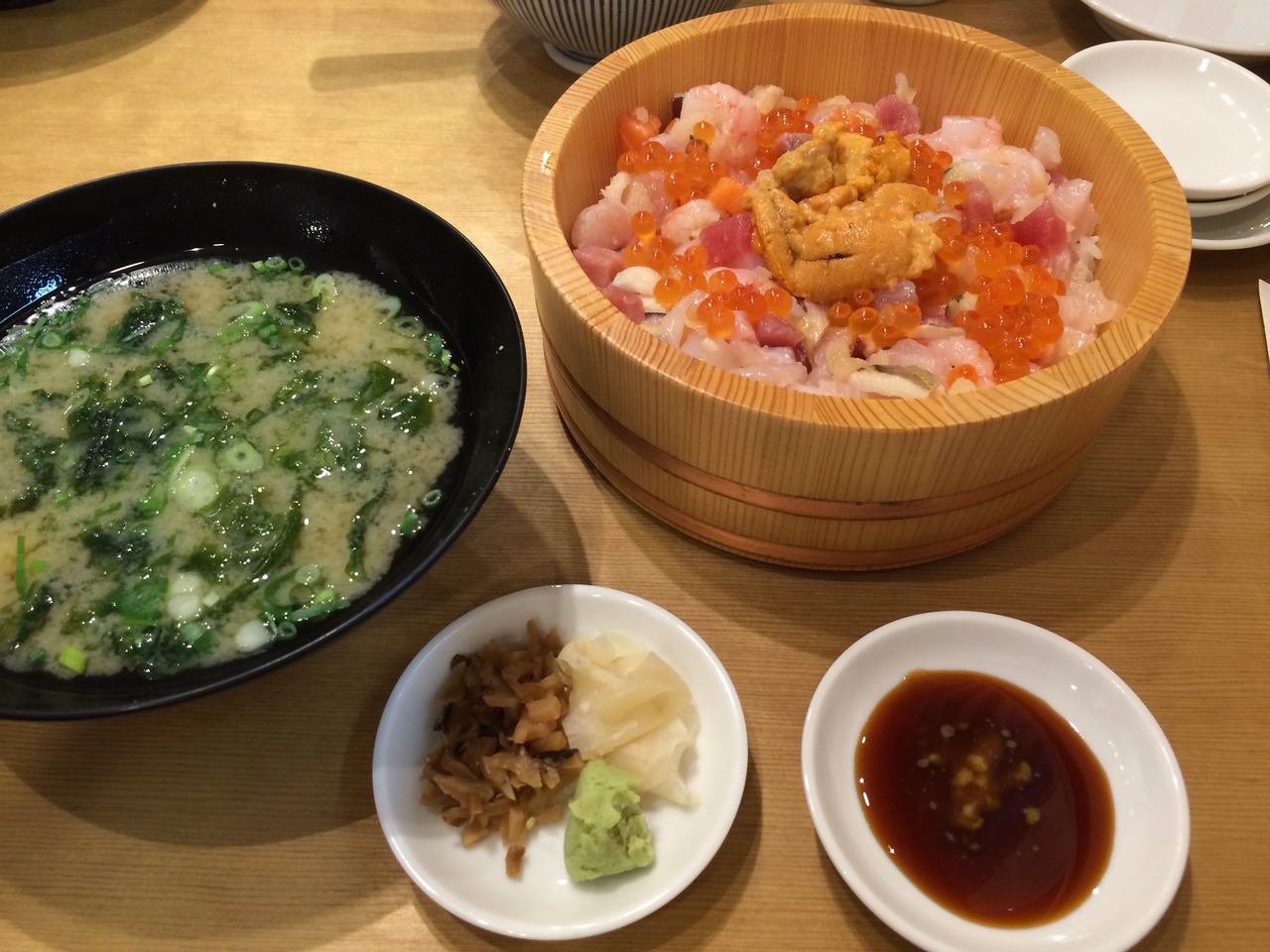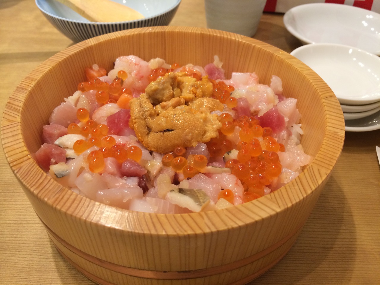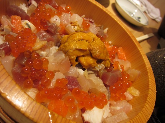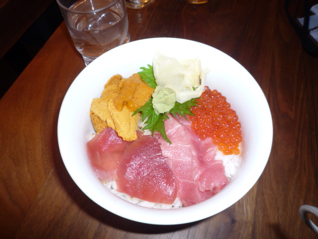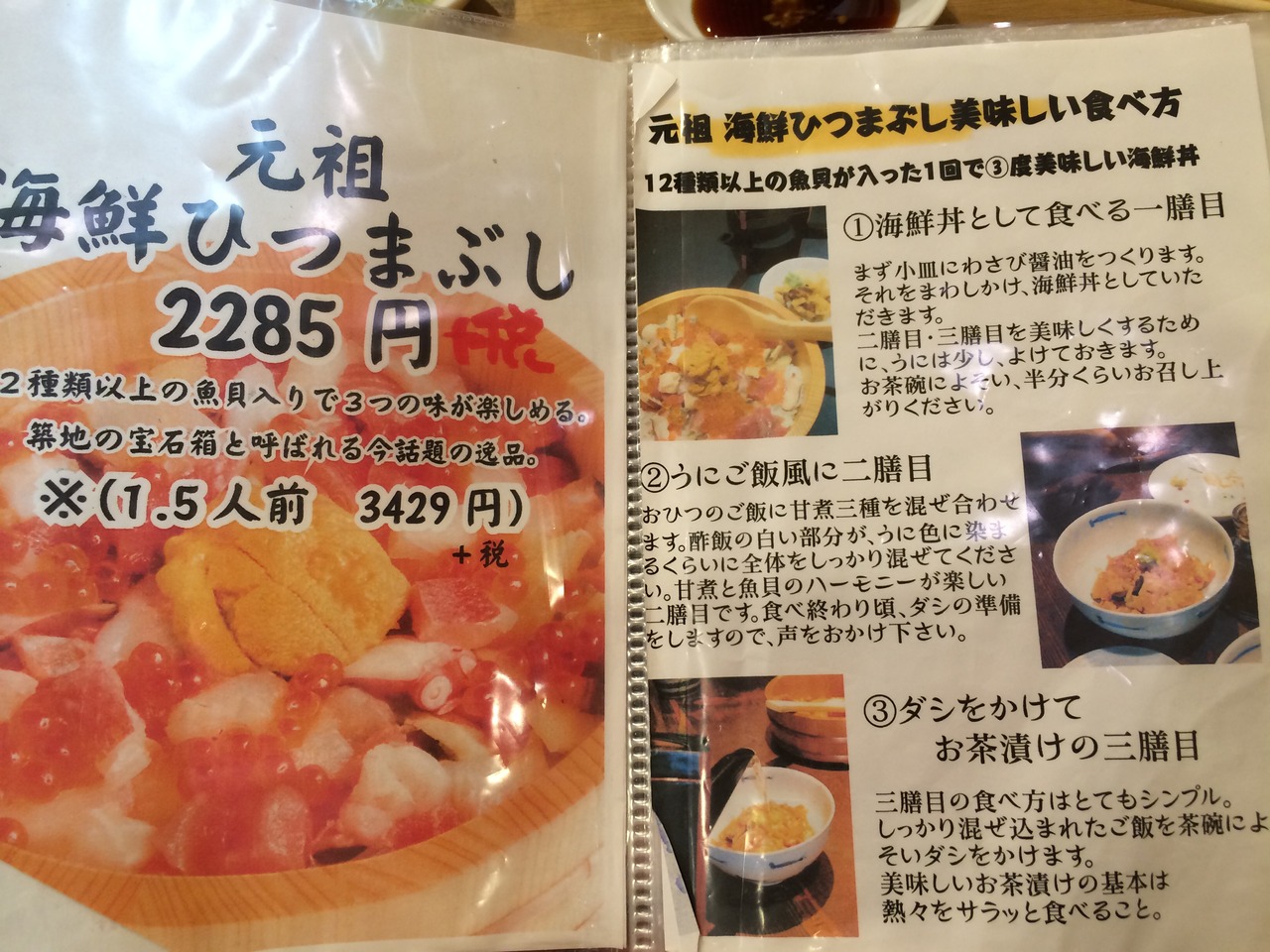 雑誌やTVなどでにも登場することがあるお店で写真は有名な海鮮ひつまぶし(2300円)です。最初は中央の海胆を除いて、普通に海鮮丼として、2杯目は海胆を潰して混ぜて海胆味で。最後は出汁をかけてお茶漬け風で。と3種類の味が楽しめます。