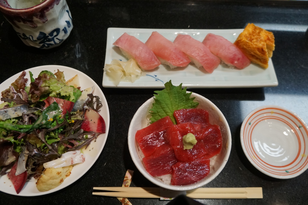 ビンチョウマグロのトロ握り3貫、まぐろ漬丼(小)、小付け、吸い物