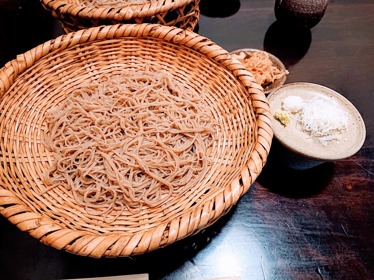 注文すると短時間ででてきます。大きなざるに、細い蕎麦が乗って出てきます。麺はかなり細めです。のろのろ食べているとみんなひっついてしまいます。つゆは、深みのある醤油ベースですが、節の風味はあまり感じられません。量は結構あります。つきあわせにはひじきがついていました。