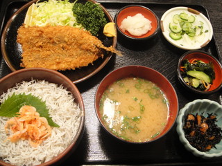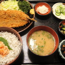 写真のように、しらすがぎっしり乗っていて、真ん中にある生の桜海老との塩気と甘みがたまりません。そして、セットでチョイスした左奥のイワシフライ。これも、軽めでサクッサクの衣とプリップリの身で、ホントに美味しかったです。