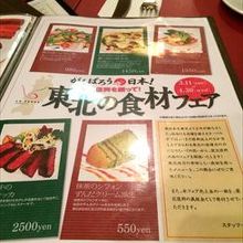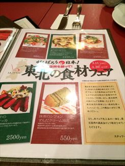 東北の食材フェアを行っていて、東北産のリンゴを使たサラダや、仙台曲りねぎを使ったピザ等、様々な食材を使い、食べる事ができます。