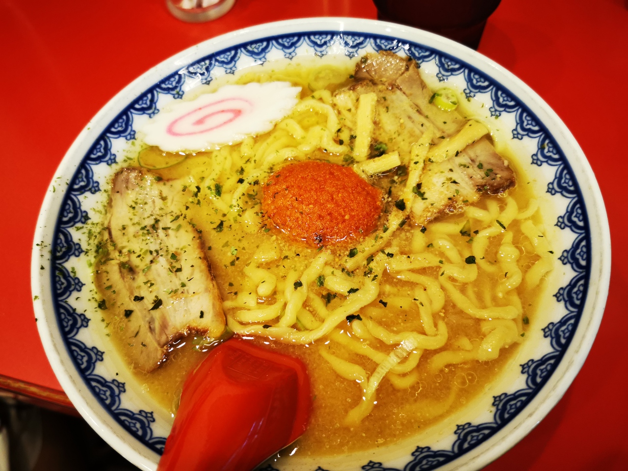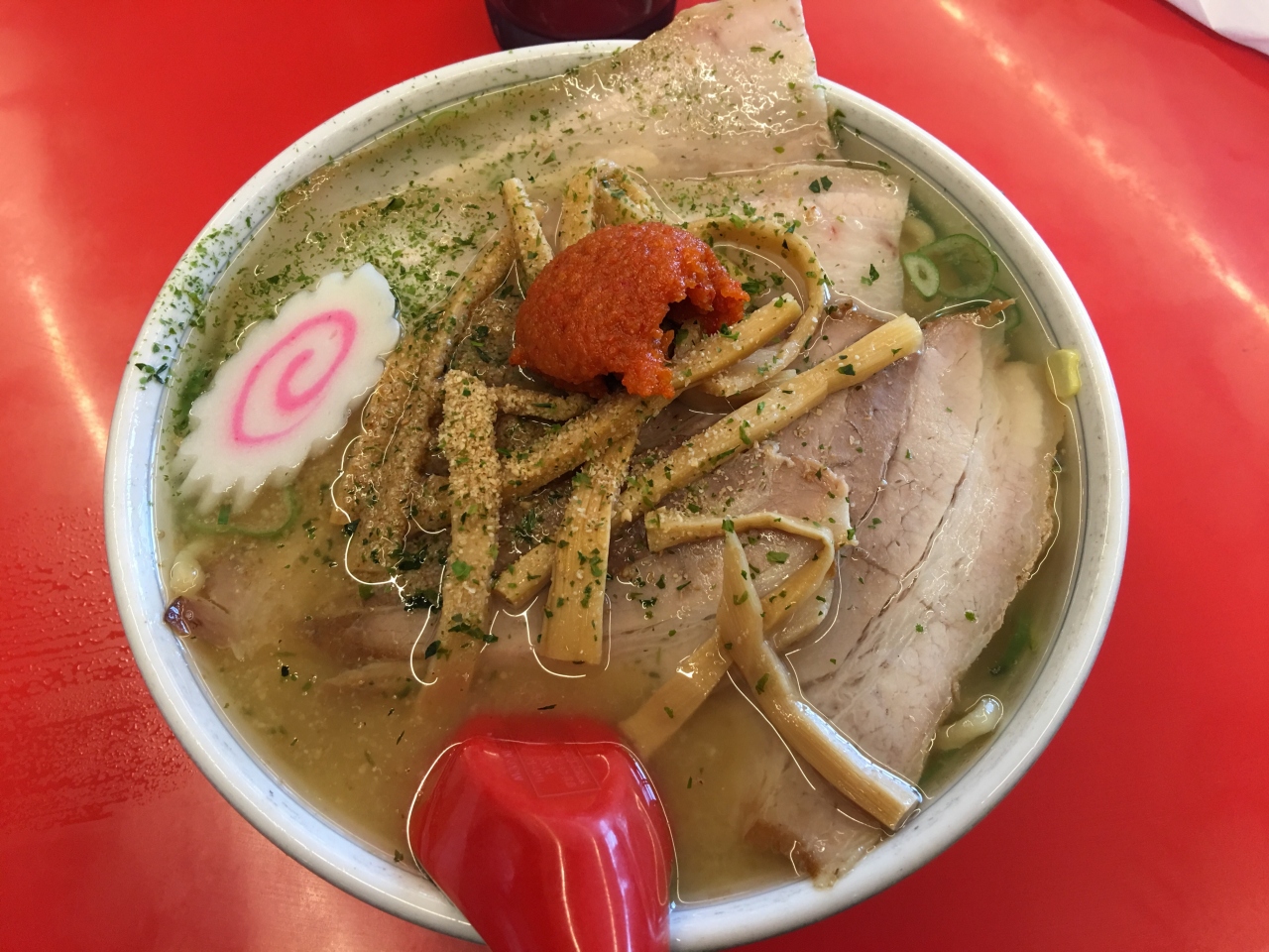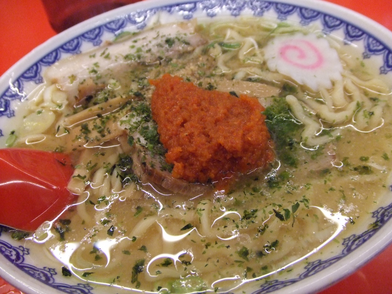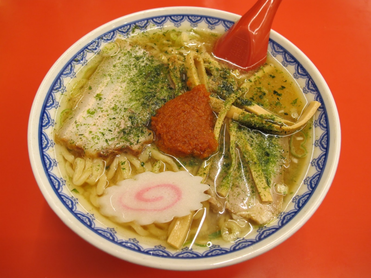 麺は太ちぢれ麺、具はチャーシューとネギとメンマとナルト、唐辛子たっぷりの味噌をスープにといていただきます。味はまずまず。ただ、唐辛子の辛さと油ののったスープの熱さで超ホットなので汗がとまらず、近くに置かれた水とティッシュを大量に消費しました。