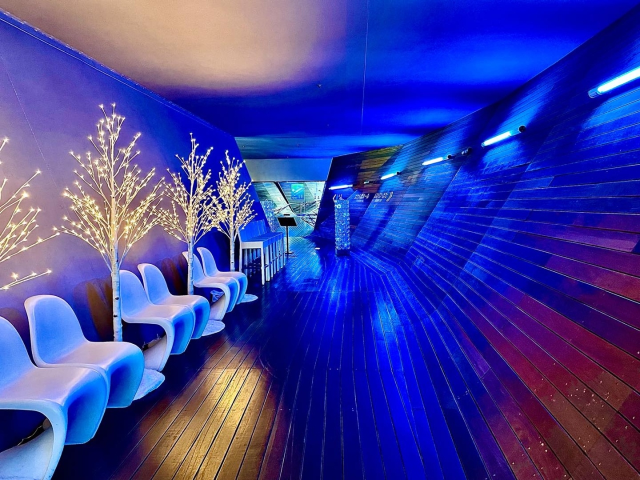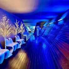 ちょっと海に沈んでいく感じの通路(ブルーの照明)を通りその先に入口があります、店内は窓が大きく海に面しているので明るくロケーションは最高です。