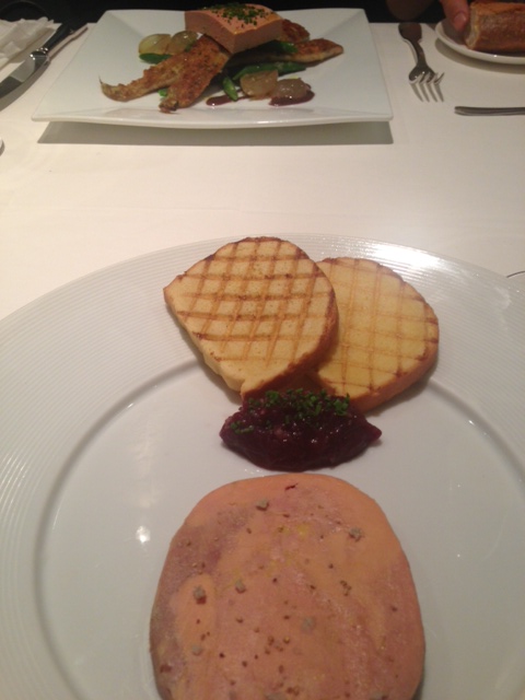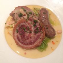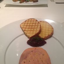 私はフォアグラのテリーヌ、白金豚の盛合せ、栗のムースを選びました。