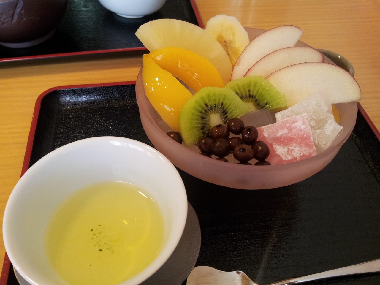 宮崎の高千穂地方の釜炒り茶を、みつまめと一緒に。おいしくいただきました。
