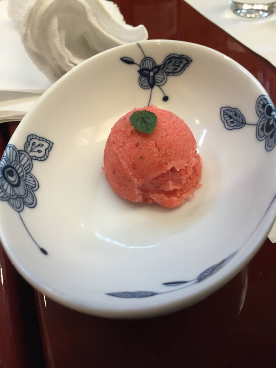 店内は本格的数寄屋造りで和装のスタッフが「柚子酒です」と食前酒をサービス。