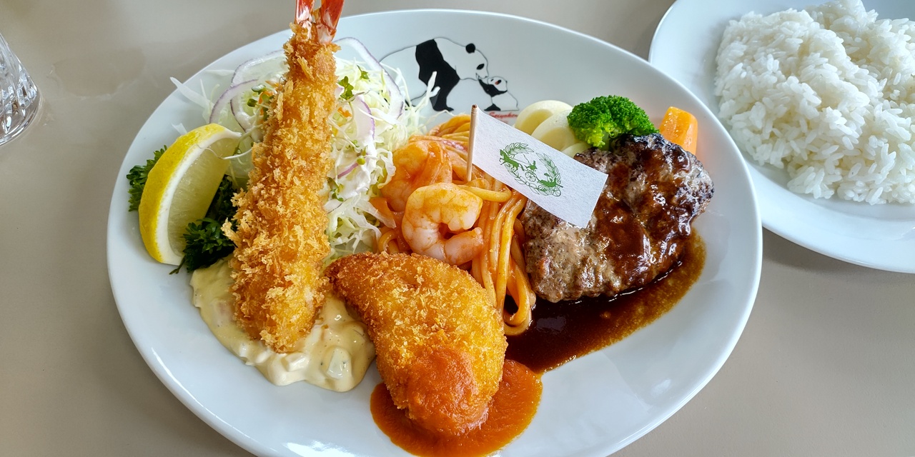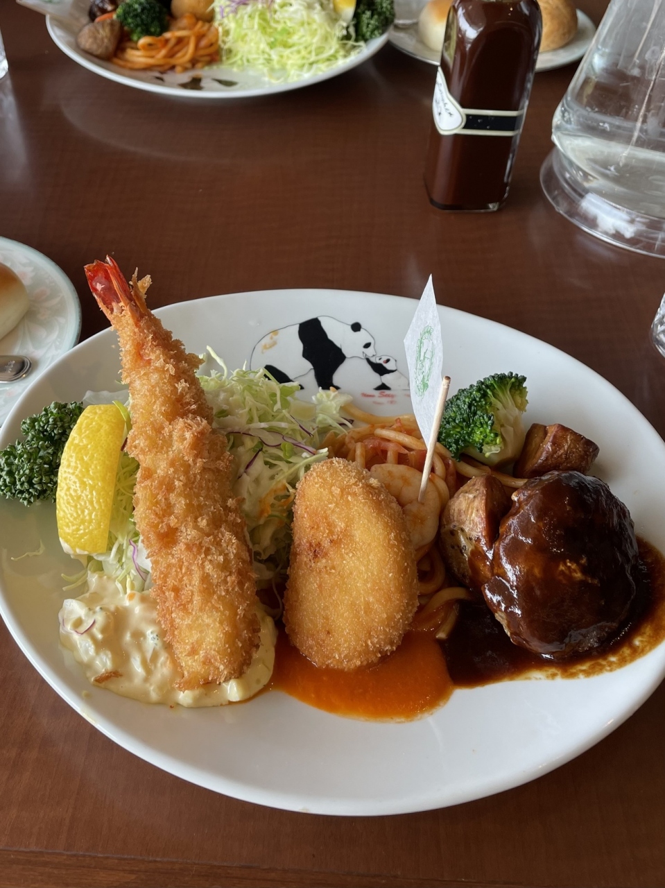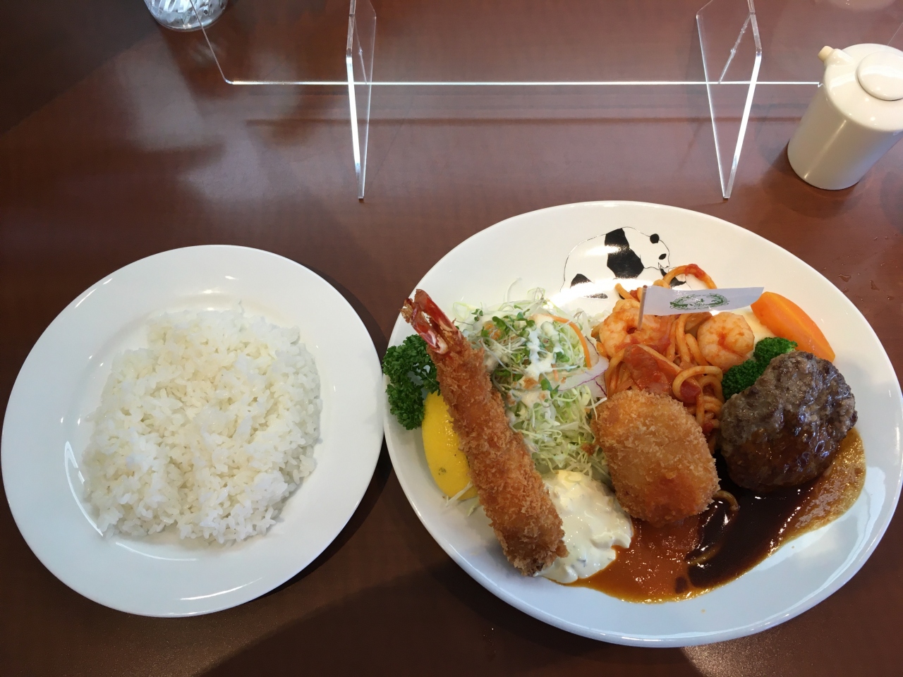 ハンバーグ、エビフライ、カニクリームコロッケにデザート&飲み物付きという洋食の王道メニューです。