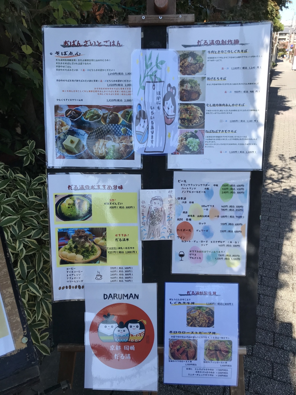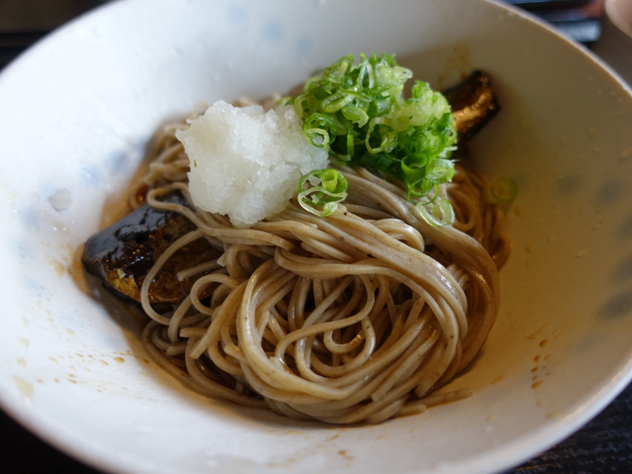 京都市美術館に行くために車を岡崎公園駐車場に入れた。先にランチを摂ろうと、二条通を西に歩き、堀を渡ったところを右折してすぐ... 続きを読む向かい側に「だる満」があった。お昼の12時半頃に到着、少し待っている人がいたが、それほど待たされずに席に案内された。「びっくり特大海老天丼」または「天ざるそば」共に2500円も魅力的だったが、おばんざいが美味しそうだったので、自家特製胡麻どうふ、おばんざい4品盛り合わせ、ミニおろしそば、炊込みご飯がセットになった「そば点心」1600円にした。妻は暖かい蕎麦、私は冷たい蕎麦を注文した。おばんざいは9種類もあった。そば点心には、人参葉の胡麻和え、小松菜煮びたし、高野豆腐、ひじき煮の4品が付いてきた。どれもヘルシーで美味しく頂いた。胡麻とうふは抹茶味だった。冷たくてプルンとしていておいしい。炊込みご飯はサツマイモごはんだった。懐かしい味だ。ミニおろしそばのトッピングは日によって変わるようだがこの日は、暖かい方には大根おろしと鰹節、海苔、葱、サツマイモが、冷たい方には大根おろし、鰹節、昆布とわさびが載っていた。蕎麦も旨かったし、食後に蕎麦湯を頼んだら、ちゃんと出てきたのには驚いた。蕎麦の旨い蕎麦屋では蕎麦湯も旨いものだが、ここの蕎麦湯も濃くて美味しかった。味のレベルはかなり高いと言える。また、利用したい。 閉じる