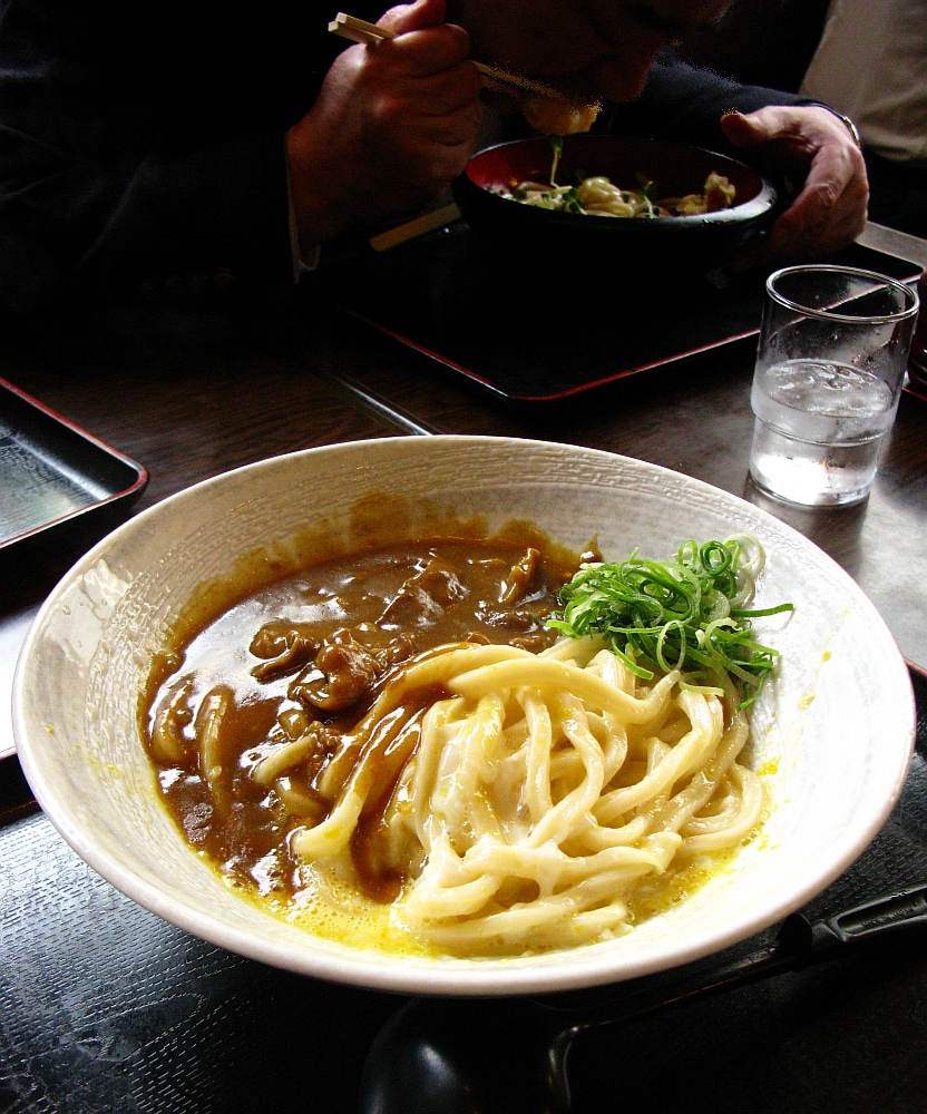 玉子を絡めた釜揚げうどんにカレールーと刻みネギ。