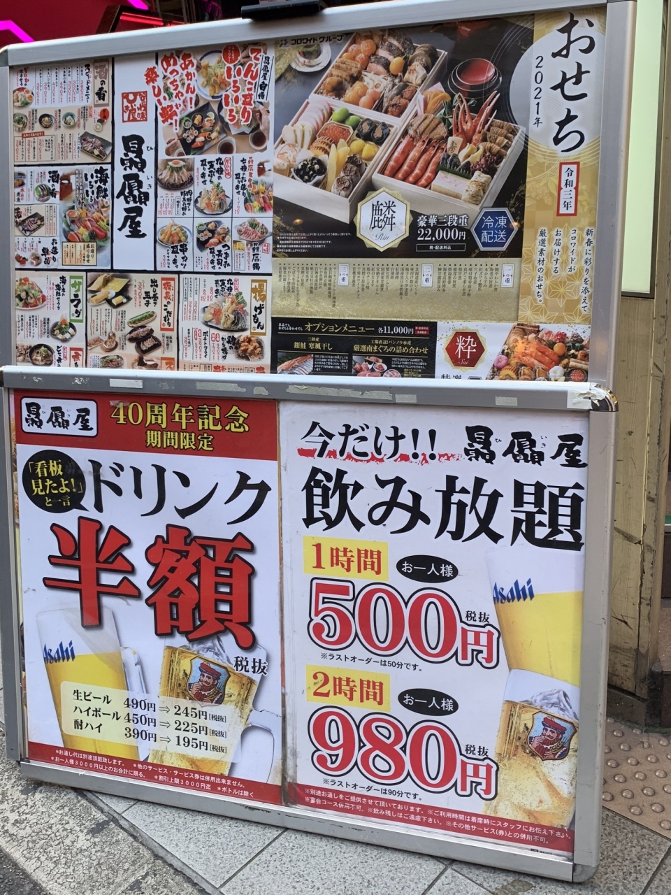 今なら 40周年記念 期間限定「看板見たよ」と一言で ドリンク半額!