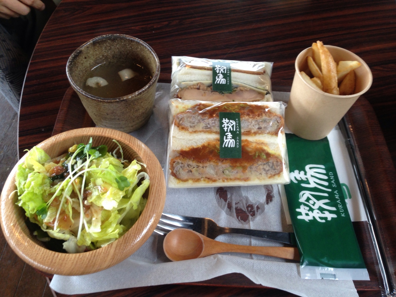 鞍馬ランチ(今日は白身魚のフライ)と7月限定のハバネロと蒸し鶏の夏野菜サンドイッチをセットにして、飲み物はホットコーヒーはお替りができると聞きホットにしました。