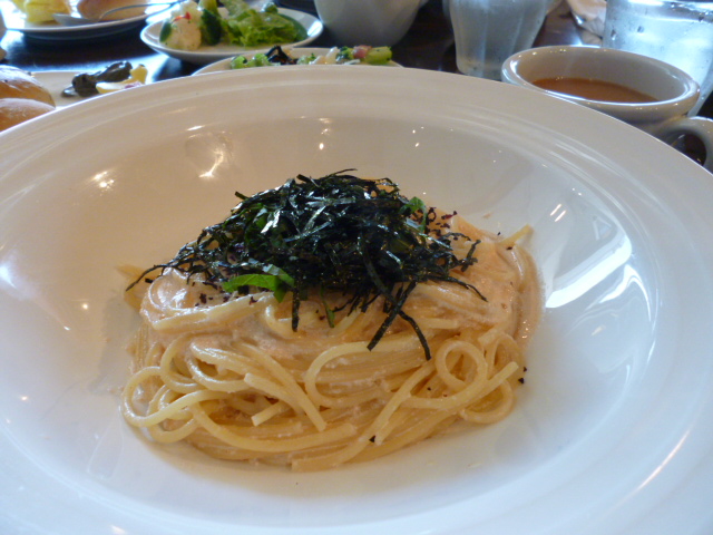 2人だったので、明太パスタとデミグラスオムライスを選んで、それに自家製パン&サラダ&スープバイキングセットにしました。