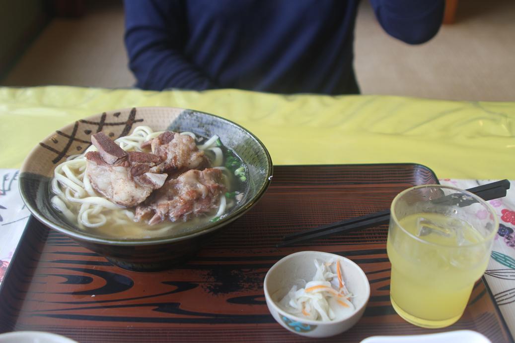ソーキそばです〜サービスのシークワァーサージュースも美味でし