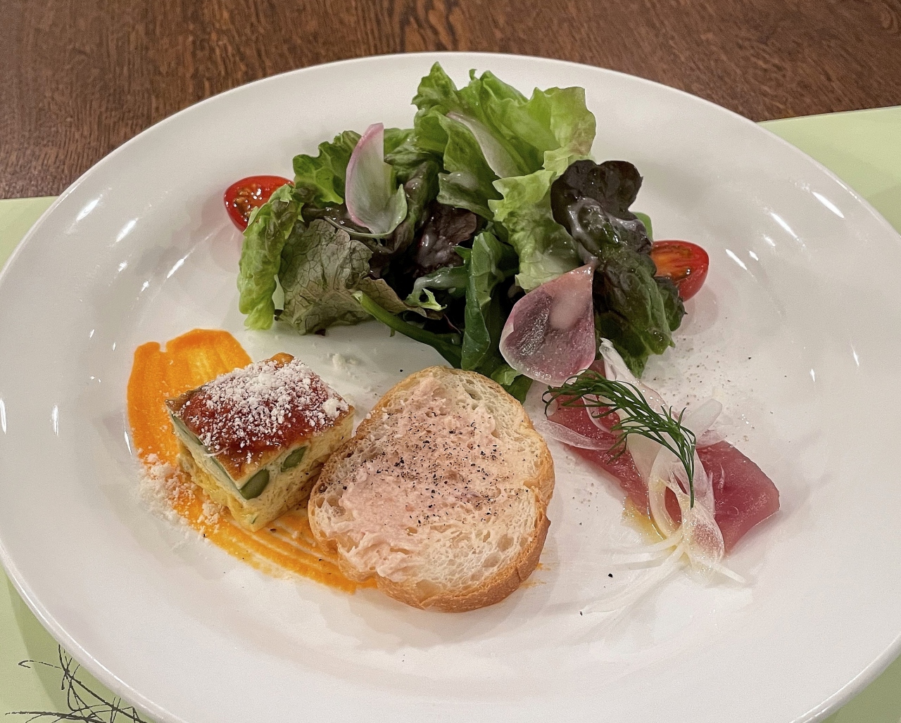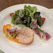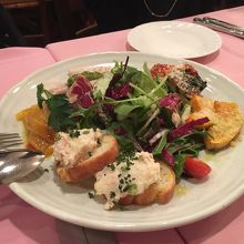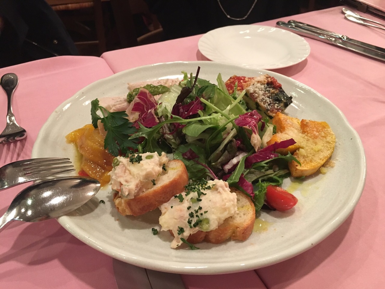 サラダはプラス金額で前菜盛り合わせに変更できる。