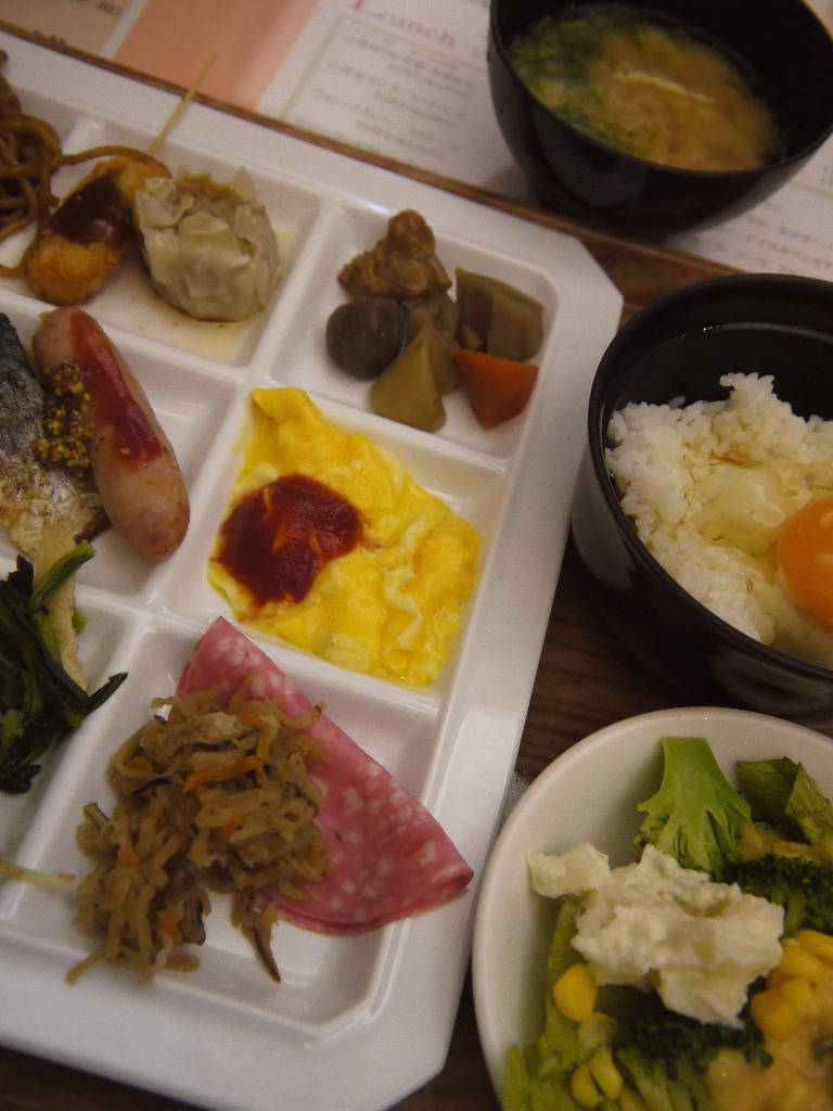 基本は和食だが(焼き魚、出し焼き卵、切り干し大根、卵掛けご飯)、洋食系のフード(グラノーラ等のシリアル、スクランブルエッグ、ソーセージ、スライスハム)もある。