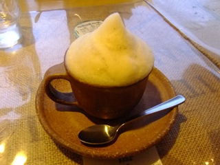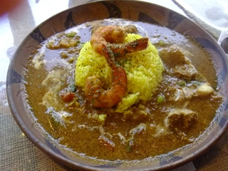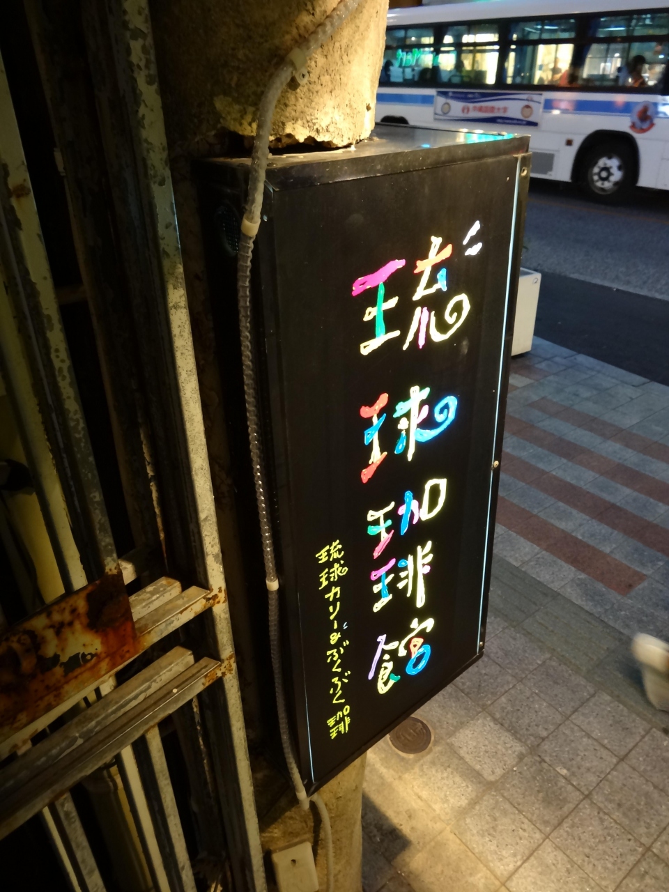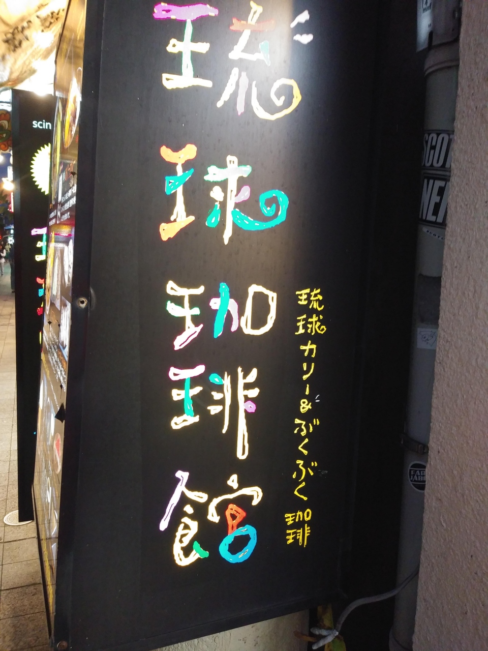 夕食は国際通りにある琉球珈琲館へ行ってきました。ひとりでも入りやすいお洒落な喫茶店で、コーヒーとカレーが美味しいと評判です... 続きを読む。コーヒーは泡が立っている「福来福来(ぶくぶく)珈琲」をいただきました。どのように飲んでよいか迷ってしまうほどの泡の立ちようで、正解なのかは判りませんがスプーンですくいながら飲みました。泡なので味はしませんでしたが、コーヒーはシナモンが強く、ウコンや大豆、ゴーヤが入っているようで不思議な味でした。私の好みではありませんでしたが、是非、試してください。カレーは沖縄でとれた新鮮な魚介類をつかった「海人カレー」をいただきました。沖縄の古酒を使っているそうで、辛過ぎず独特の風味でとても美味しかったです。