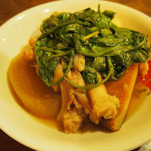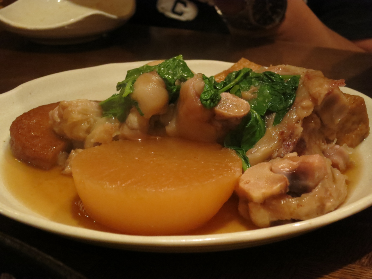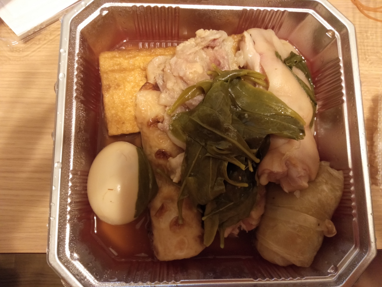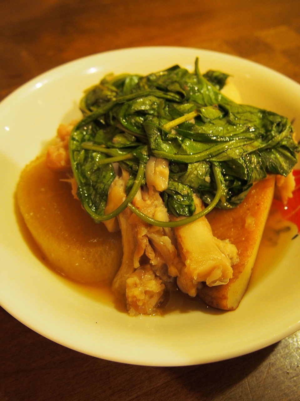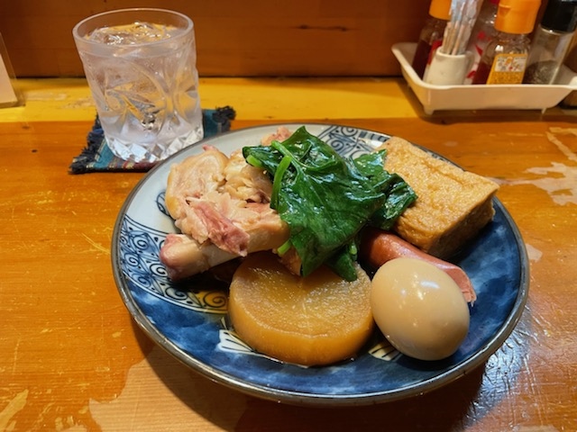 おでんは本土では一般的な1品1品好きな物を注文するタイプではなく、注文すればおでんの盛り合わせが出てきます。大根・玉子・厚揚げ・豚足・フチーバーの5種盛。