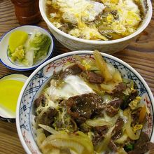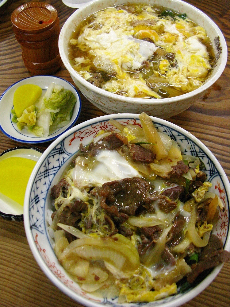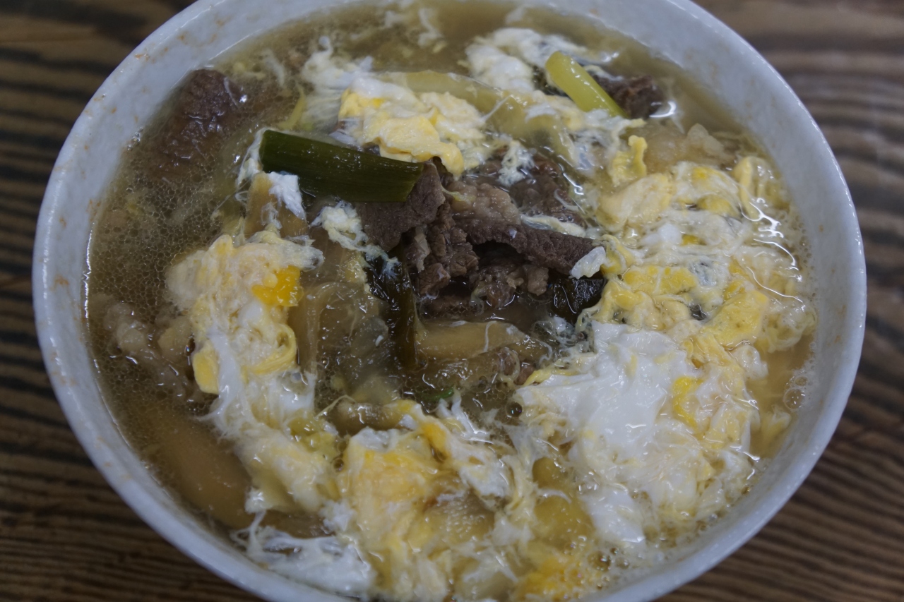 玉ねぎの硬い皮の部分も入っててちょっと無骨な牛丼を卵でとじたって感じ。