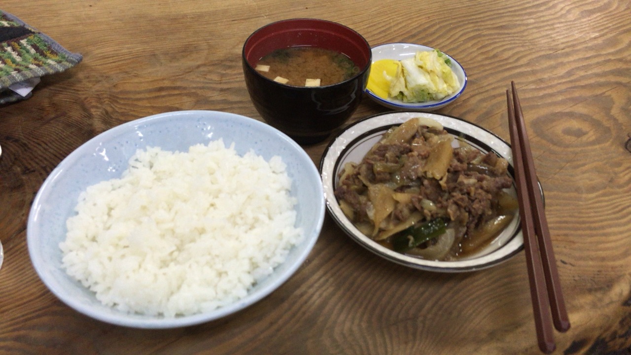 牛肉・玉ネギ・ぶつ切りのネギ・ゴボウ。黄色いタクワンと白菜の漬物は量もあって○。