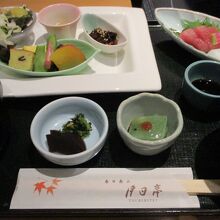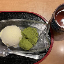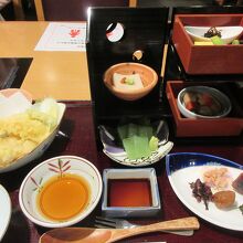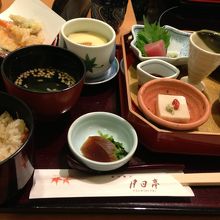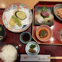 予約してあったランチ限定メニューである「点心膳」は、箱盛(造り2種盛、鮭柚庵焼き なます添え、豆冨、ヤマトポーク角煮)と天婦羅盛から構成されており、それにご飯・吸物・香の物が付いています。県産豚であるヤマトポークの角煮は美味しかったのですが、母はそういった料理を好まないこともあり、気に入らなかったようです。「春日奥山の本店とは別物だよ」と伝えてはあったのですが、勝手にハードルを上げていて、ガッカリ感も強そうでした。私はお造りと白飯は悪くなかったと思いましたが。デザートに注文したバニラアイスと抹茶わらび餅も普通でした。