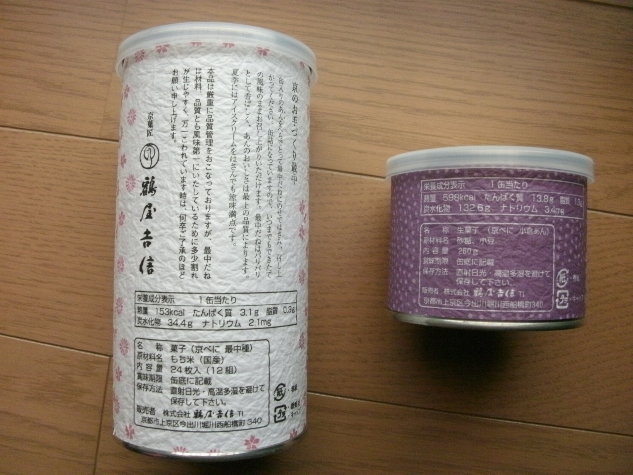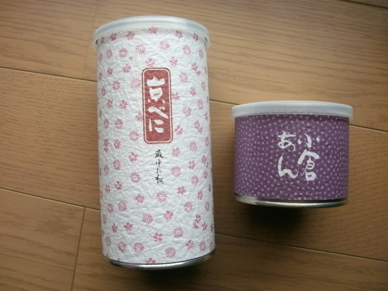 そんな中から今日は「京べに」と名付けられた最中を買いました。「京べに」は最中の皮(24枚入り)と餡(小倉餡・柚子風味のこし餡の二種類あり)が別々に缶に入ったもので、一枚の皮に付属のへらで餡をのせ、もう一枚の皮ではさんで食べる“手造り最中”です。