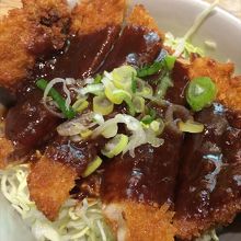 味噌かつ丼です。ここでは、カレーうどんが有名ですが、それ以外に、この味噌かつ丼がおいしいです